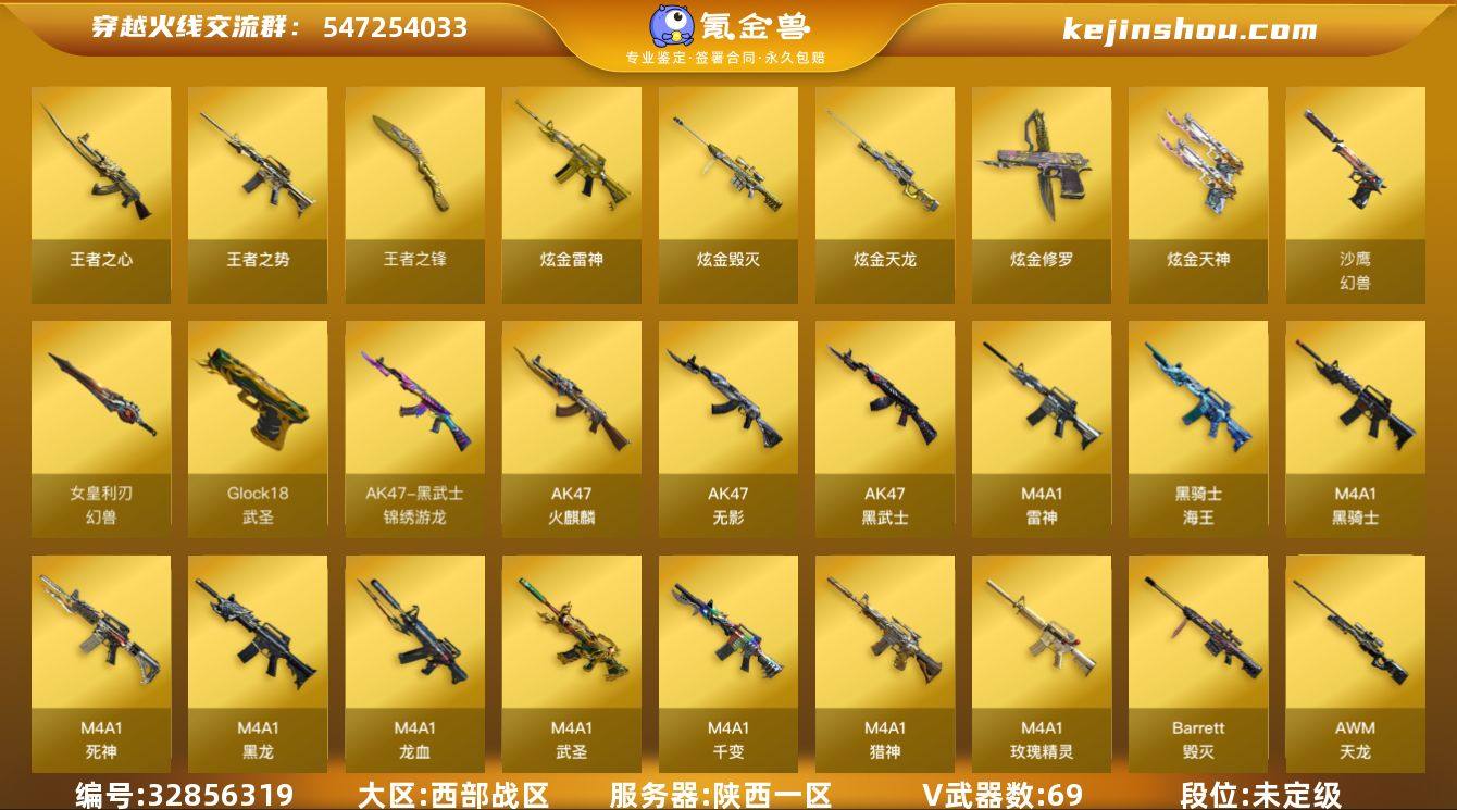 【生化号/QBZ03-金色蔷薇/炫金天龙/炫金天神*2陕西一区-71V-5王者-6炫金\汤姆逊-烈龙*6,RPK-盘龙*6】 【热门武器】:QBZ03-金色蔷薇,死亡之眼*2,金色小号,M4A1-黑骑士,汤姆逊-烈龙*6,RPK-盘龙*6,加特林-炼狱*2,沙鹰-修罗*5,高爆手雷-幻兽 【王者炫金武器】:炫金天龙,炫金天神*2,炫金毁灭,炫金雷神,炫金修罗,王者之势,王者之心,王者之锋 【音效卡】:AK47-火麒麟音效卡,M4A1-雷神音效卡,Barrett-毁灭音效卡 【稀有皮肤】:雷神-能量核心,雷神-星空,毁灭耀金皮肤 【角色】:王者之瞳,零-水下丽影,樱,蜀雪,魅影,铁骑荣耀 【人偶武器】:COP-旗袍,迷你艾比,生化手雷-机甲核心 【暴走生化】:死亡之眼*2 【挑战大师】:阐释者III,激光毁灭者III,冰龙粉碎者-白马银枪 【英雄级武器】:沙鹰-幻兽,女皇利刃-幻兽,M4A1-武圣,Glock18-武圣,QBZ03-金色蔷薇,M4A1-雷神*2,M4A1-黑龙,M4A1-玫瑰精灵,M4A1-黑骑士,M4A1-死神*2,RPK-盘龙*6,加特林-炼狱*2,汤姆逊-烈龙*6,AK47-无影,AK47-火麒麟,AK47-黑武士,AK12-天启,AN94-超新星,AWM-天龙*3,Barrett-毁灭,AWM-裁决*2,M4A1-龙血,M4A1-猎神,M4A1-千变,黑武士-锦绣游龙,黑骑士-海王,沙鹰...