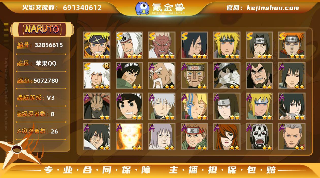 IOS/8S忍/26A忍/战力507W/V3/区服515 【S忍者】 宇智波佐助「漩涡鸣人」,艾「忍界大战」,宇智波斑「秽土转生·解」,自来也「舞之豪杰」,自来也「传说中的三忍」,宇智波鼬「须佐能乎」,佩恩「天道」,波风水门, 【A忍者】 机械鸣人「初始形态」,大野木「侠隐江湖」,迈特凯「青春爆炸」,日向宁次「忍界大战」,漩涡博人「桃式显现」,旗木卡卡西「幻之真容」,李洛克「忍界大战」,蝎「绯流琥」,宇智波泉奈,神农「羁绊」,桃地再不斩「秽土转生」,波风水门「青年」,宇智波佐助「须佐能乎」,宇智波带土「暴怒」,漩涡鸣人「九尾查克拉」,千代「近松十人卫」,秋道丁次「忍界大战」,照美冥「五代目水影」,飞段「死司凭血」,飞段,我爱罗「疾风传」,蝎,干柿鬼鲛,猿飞阿斯玛,迈特凯, PX_2405445