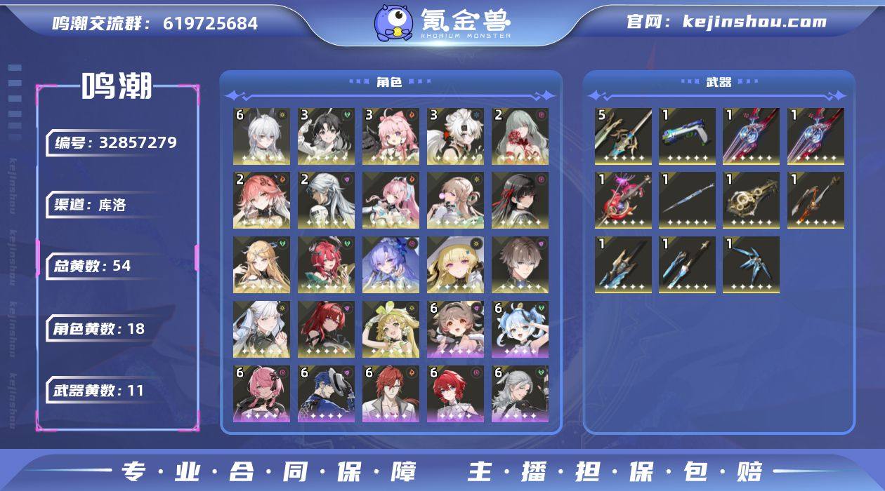 联觉等级】:80级 【黄数】:54 【五星角色】:2命弗洛洛,0命坎特蕾拉,0命今汐,0命千咲,0命卡提希娅,0命夏空,6命赞妮,0命菲比,2命长离,0命维里奈,0命吟霖,3命安可,2命卡卡罗,3命鉴心,0命相里要,0命爱弥斯,0命琳奈,3命凌阳 【四星角色】:6命散华,6命白芷,6命渊武,6命丹瑾,6命秧秧,6命炽霞,6命灯灯,6命釉瑚,6命莫特斐,6命桃祈,6命秋水 【金色武器】:精1浩境粼光,精1赫奕流明,精5血誓盟约,精1漪澜浮录,精1千古洑流,精1昙切,精1不屈命定之冠,精1焰光裁定,精1相位涟漪,精1昙切,精1幽冥的忘忧章 【数据坞等级】:28 【余波珊瑚】:16 【残振珊瑚】:5180 【星声】:932 【浮金波纹】:5 【唤声涡纹】:1 【铸潮波纹】:0 【皮肤】:桂枝宁芙,桃夭灼灼