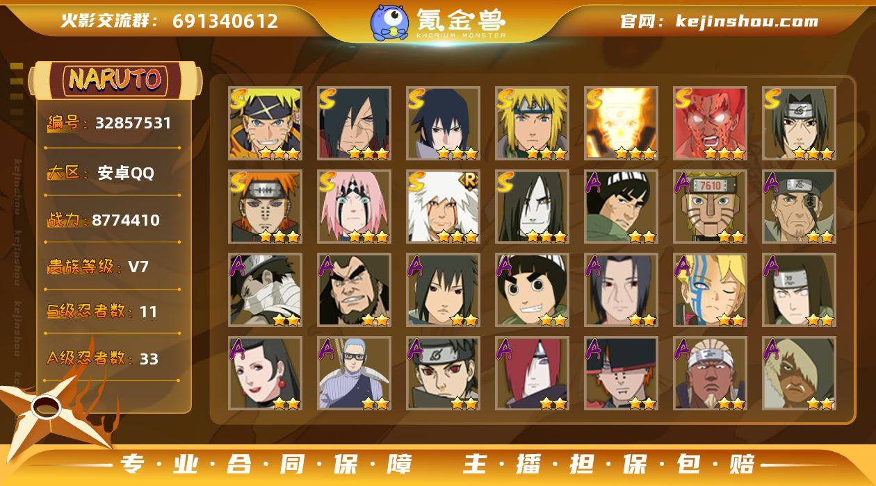 11S忍/33A忍/战力877W/V7/区服2973 【S忍者】 宇智波佐助「漩涡鸣人」,宇智波斑「秽土转生·解」,宇智波佐助「永恒万花筒」,春野樱「忍界大战」,漩涡鸣人「九喇嘛连结」,迈特凯「死门」,自来也「舞之豪杰」,宇智波鼬「须佐能乎」,佩恩「天道」,波风水门,大蛇丸, 【A忍者】 佩恩·六道「漂泊浪客」,机械鸣人「初始形态」,迈特凯「青春爆炸」,土台「忍界大战」,长十郎「六代目水影」,不缘,日向宁次「忍界大战」,漩涡博人「桃式显现」,宇智波鼬「夏日限定」,李洛克「忍界大战」,宇智波泉奈,神农「羁绊」,桃地再不斩「秽土转生」,宇智波止水,长门「青年」,艾「青年」,达鲁伊「五代目雷影」,波风水门「青年」,宇智波佐助「须佐能乎」,漩涡鸣人「九尾查克拉」,千代「近松十人卫」,秋道丁次「忍界大战」,宇智波佐助「万花筒写轮眼」,奇拉比,飞段「死司凭血」,飞段,迪达拉,我爱罗「疾风传」,蝎,干柿鬼鲛,宇智波鼬,猿飞阿斯玛,迈特凯, PX_2392418