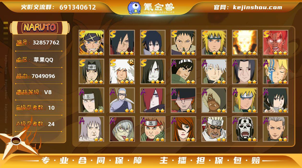 IOS/10S忍/24A忍/战力704W/V8/区服517 【S忍者】 宇智波佐助「漩涡鸣人」,宇智波斑「秽土转生·解」,宇智波佐助「永恒万花筒」,漩涡鸣人「九喇嘛连结」,迈特凯「死门」,宇智波带土「忍界大战」,自来也「舞之豪杰」,宇智波鼬「须佐能乎」,波风水门,大蛇丸, 【A忍者】 迈特凯「青春爆炸」,长十郎「六代目水影」,日向宁次「忍界大战」,漩涡博人「桃式显现」,宇智波鼬「夏日限定」,旗木卡卡西「幻之真容」,长门「青年」,佩恩·六道「漂泊浪客」,达鲁伊「五代目雷影」,波风水门「青年」,宇智波佐助「须佐能乎」,千代「近松十人卫」,药师兜「半蛇斗篷」,秋道丁次「忍界大战」,照美冥「五代目水影」,奇拉比,飞段「死司凭血」,飞段,我爱罗「疾风传」,蝎,干柿鬼鲛,猿飞阿斯玛,迈特凯, PX_2387870