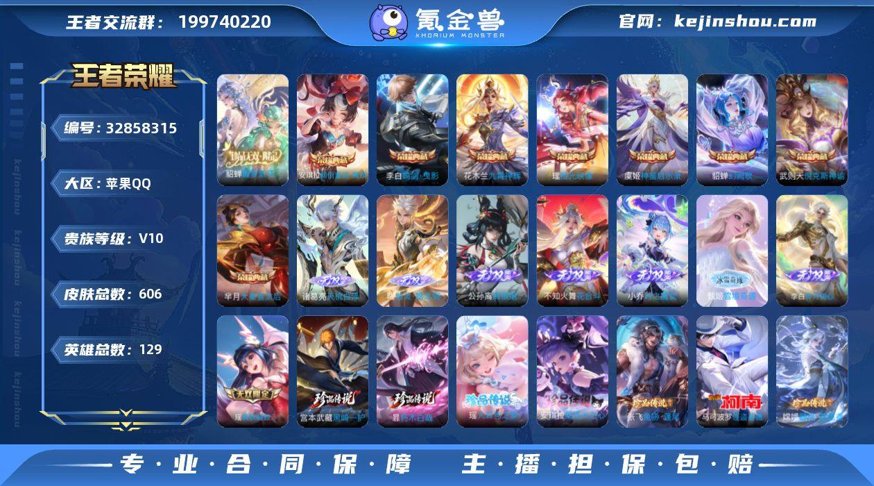 实名: 不可修改 贵族等级: V10 英雄数: 129 皮肤数: 606 荣耀水晶: 武则天,倪克斯神谕,大秦宣太后,鸣剑·曳影,九霄神辉,幻阙歌,神鉴启示录,拾光映像,颠倒童话·魔镜 无双皮: 真我赫兹(瑶),碎月剑心,小乔时之魔女,花合斗,离恨烟,雪境奇遇-甄姬,器灵·螭龙剑,天机白泽 珍品传说: 江户川柯南,怪盗基德,器灵·落星盏,兔狲·蓬尾,酷洛米之心,大耳狗之梦,朽木白哉,黑崎一护 星传说: 幻海之心,幽冥之眼,零号·雷霆,幽冥火,金色仲夏夜,太华·红枫 传说皮: 黄金狮子座,冠军飞将,云鹰飞将,黄金白羊座,猫影幻舞,久胜战神,炽阳神光,一念神魔,仲夏夜之梦,零号·赤焰,海洋之心,地狱之眼,飞鸢探春,胖达荣荣,乞巧织情,时之恋人-刘备,游龙清影,淬星耀世,超时空战士-狄仁杰,遇见胡旋,末日机甲-孙策,花朝如约,无双飞将,百相守梦(张飞),追逃游戏(亚瑟),灼幽烈阳,小动物乐团,霜月吟,艾琳觅芳踪,乘龙·问璇玑,乘龙·铭钟鼎,乘龙·淬吴钩,貂蝉曦玄引,落雪白狼,金乌负日,黄金天蝎座,云中君群星魔术团,朵莉亚心动手记,牧神诗旅,启明星使,幻光神枪,千劫归真,千山共赴,神树通天,长夜焕生,神骥·赴朔漠,神骥·鸣幻洲,神骥·越千峰,神骥·逐星野,神骥·镇沧海,神骥·聚万邦,罗刹妄海 限定皮: 遇见飞天,李小龙,奔雷神使,梁祝,...