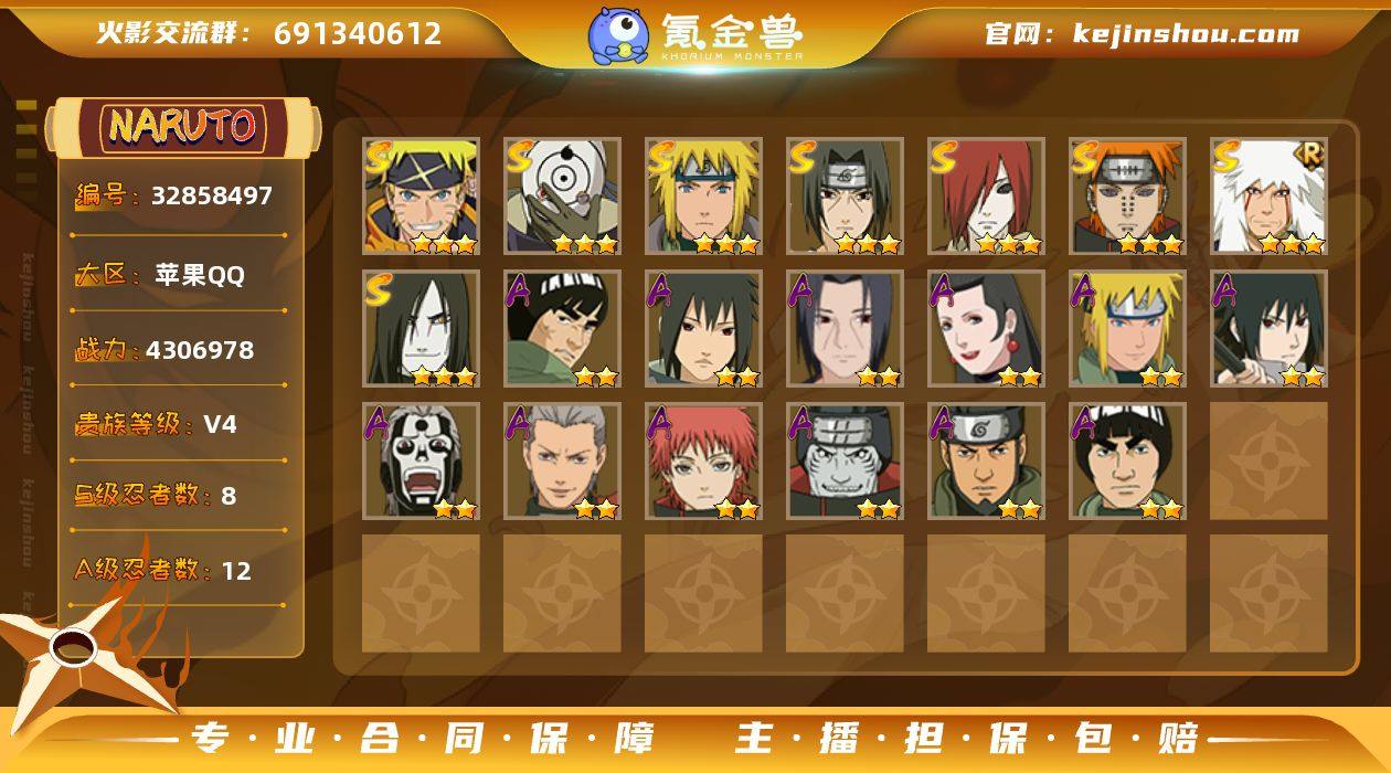 IOS/8S忍/12A忍/战力430W/V4/区服528 【S忍者】 宇智波佐助「漩涡鸣人」,自来也「舞之豪杰」,宇智波斑「白面具」,长门「秽土转生」,宇智波鼬「须佐能乎」,佩恩「天道」,波风水门,大蛇丸, 【A忍者】 迈特凯「青春爆炸」,不缘,宇智波鼬「夏日限定」,宇智波泉奈,波风水门「青年」,宇智波佐助「须佐能乎」,飞段「死司凭血」,飞段,蝎,干柿鬼鲛,猿飞阿斯玛,迈特凯, PX_2376762