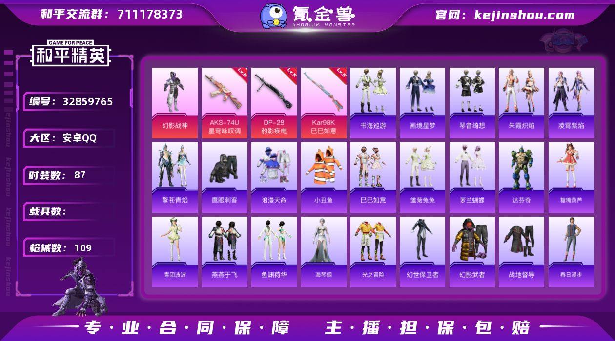 J2953 精品 1粉 5特 幻影战神 小丑鱼 狂沙舞者 安卓 手Q-1粉装-5特效枪-0载具-0粉色飞行器-27924热力值-4王牌印记-87套装-109枪皮 【热门品类】:套装-浪漫天命,套装-小丑鱼 【粉色套装】:粉装-幻影战神 【粉色枪皮等级】:UMP45-萌骑冒险(三级),AKS-74U-星穹咏叹调(六级),Kar98K-巳巳如意(五级),Mk14-福马献瑞(五级),DP-28-豹影疾电(五级) 【粉色枪皮】:UMP45-萌骑冒险,AKS-74U-星穹咏叹调,Kar98K-巳巳如意,Mk14-福马献瑞,DP-28-豹影疾电 【粉色降落伞】:绝对恒星降落伞,未来领航者降落伞,鬼刀降落伞,幻彩电音降落伞,喜羊羊与灰太狼降落伞,炫彩糖果降落伞 【稀有套装】:套装-巳巳如意,角色-罗莉,套装-马上来财,套装-迅捷龙虾,套装-雏菊兔兔,套装-萝兰蝴蝶,角色-达芬奇,套装-糖糖葫芦,套装-青团波波,套装-燕燕于飞,套装-鱼渊荷华,角色-海琴烟,套装-朱霞炽焰,套装-凌霄紫焰,套装-擎苍青焰,套装-书海巡游,套装-画境星梦,套装-琴音绮想 【稀有枪皮】:AKM-影袭,AKM-破晓战魂,AKM-龙的传人,M16A4-红色方程式,M16A4-蓝色火焰,SCAR-L-夜灯,SCAR-L-炫彩节奏,SCAR-L-红色方程式,M416-快乐主宰,M416-红色方程式,M416-蓝色火焰,GROZA-影...