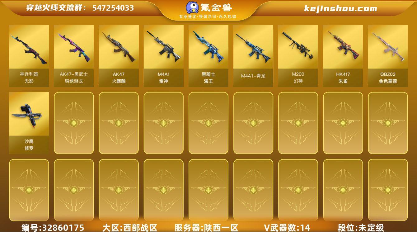 陕西一区-16V-0王者武器数-0炫金武器数 【热门武器】:QBZ03-金色蔷薇,HK417-朱雀,M4A1-青龙,M200-幻神,沙鹰-修罗*3 【皮肤】:雷神-源计划2.0专属 皮肤 【角色】:战地猎狐,电竞少女,飞虎队-X,风暴女,嘉年华灵狐,灵狐者-X,萌儿,潘多拉-X,斯沃特-X,兔囡囡 【人偶武器】:AWM-灵狐-15周年嘉年华,迷你波特博士,迷你生化手雷,迷你巨石泰坦-魔花研究所,灵狐娃娃手雷*2 【暴走生化】:超级对讲机 【挑战大师】:AK47-冰龙粉碎者,神圣爆裂者-末日III 【英雄级武器】:AK47-火麒麟,M4A1-雷神,M4A1-青龙,HK417-朱雀,无影-神兵利器,黑武士-锦绣游龙,QBZ03-金色蔷薇,黑骑士-海王,机械迷城-穹宇,M200-幻神,沙鹰-修罗*3 【道具】:全能枪王背包,超级背包,救世主-黑桃战神,绿色巨人,灵魂忍者*2,迷雾幽灵,夺命之镰,防化服*3,金色流光-枪王排位*2,星辰流光-枪王排位,枪王排位28赛季金色流光,枪王排位29赛季金色流光,EP战队名片,EP战队喷图,防弹头盔*4,防弹衣*4,C4工具钳*4,手雷包*4 【特殊枪械】: