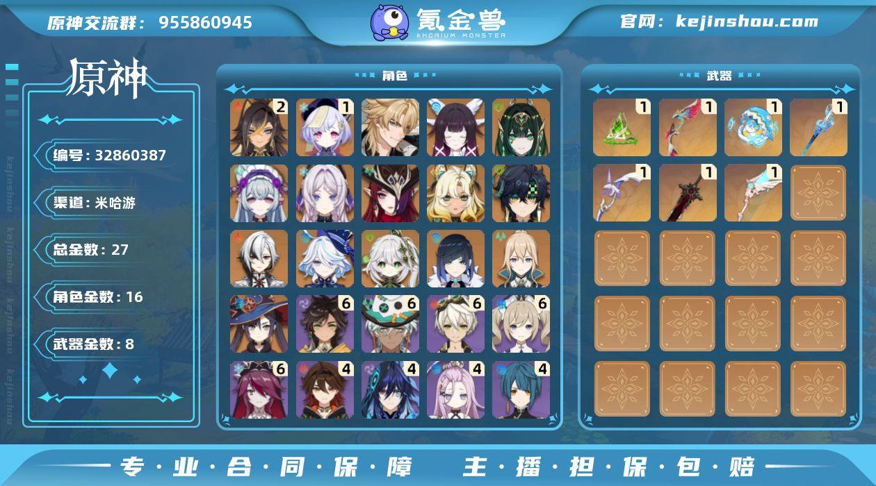 邮箱: 未绑定 总黄数: 27 冒险等级: 58 2命金色角色: 二命迪希雅 1命金色角色: 一命七七 0命金色角色: 莫娜,琴,夜兰,纳西妲,芙宁娜,阿蕾奇诺,基尼奇,希诺宁,恰斯卡,茜特菈莉,梦见月瑞希,奈芙尔,哥伦比娅,法尔伽 拥有武器: 狼的末路,天空之翼,阿莫斯之弓,静水流涌之辉,冲浪时光,星鹫赤羽,真语秘匣 1精武器: 狼的末路,天空之翼,阿莫斯之弓,静水流涌之辉,冲浪时光,星鹫赤羽,真语秘匣