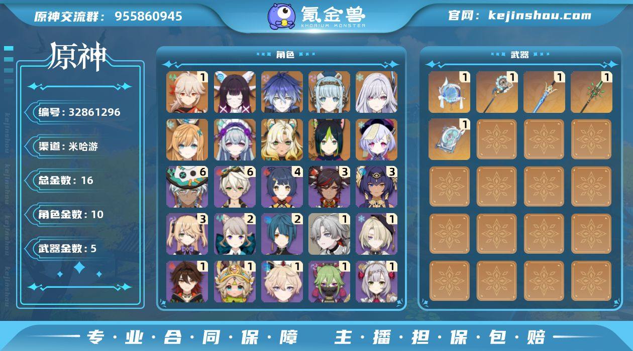 16黄!冰水战舰!月感电战舰!丝柯克+爱可菲!0+1少女!0+1伊涅芙!菲林斯!希诺宁!1+1万叶!冒险等级: 56 1命金色角色: 一命枫原万叶 0命金色角色: 七七,提纳里,希诺宁,梦见月瑞希,爱可菲,丝柯克,伊涅芙,菲林斯,哥伦比娅 拥有武器: 四风原典,和璞鸢,苍古自由之誓,支离轮光 1精武器: 四风原典,和璞鸢,苍古自由之誓,支离轮光,帷间夜曲 亮点: 角色池没歪过,账号很欧皇,主线和大的开图任务都做完了,只注册过原神,未绑邮箱,绑定干净