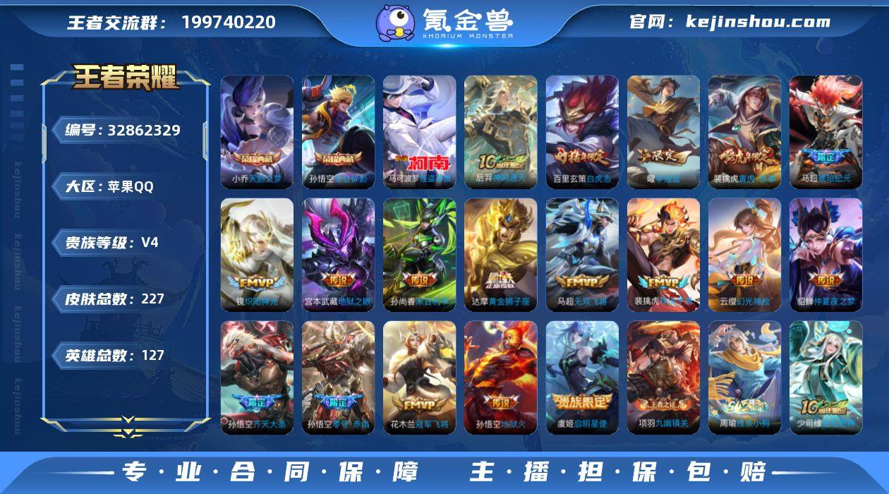 实名: 可修改 性别: 男号 贵族等级: V4 英雄数: 127 皮肤数: 227 荣耀水晶: 天鹅之梦,全息碎影 珍品传说: 怪盗基德 传说皮: 黄金狮子座,冠军飞将,炽阳神光,末日机甲-孙尚香,地狱火,仲夏夜之梦,零号·赤焰,地狱之眼,李逍遥,无双飞将,琥珀纪元马超,幻光神枪,祥瑞亨通,神树通天 限定皮: 冰霜恋舞曲,美猴王,白虎志,瑞麟志,梅西,至尊宝,大圣娶亲,孙行者,寅虎·赤拳,齐天大圣 亮点: 【优质装备】:天鹅之梦(小乔典藏),全息碎影(猴子典藏),怪盗基德,黄金狮子座,冠军飞将,炽阳神光,末日机甲-孙尚香(绿蚂蚱),地狱火,仲夏夜之梦(大飞蛾),零号·赤焰,地狱之眼,李逍遥,无双飞将,琥珀纪元马超