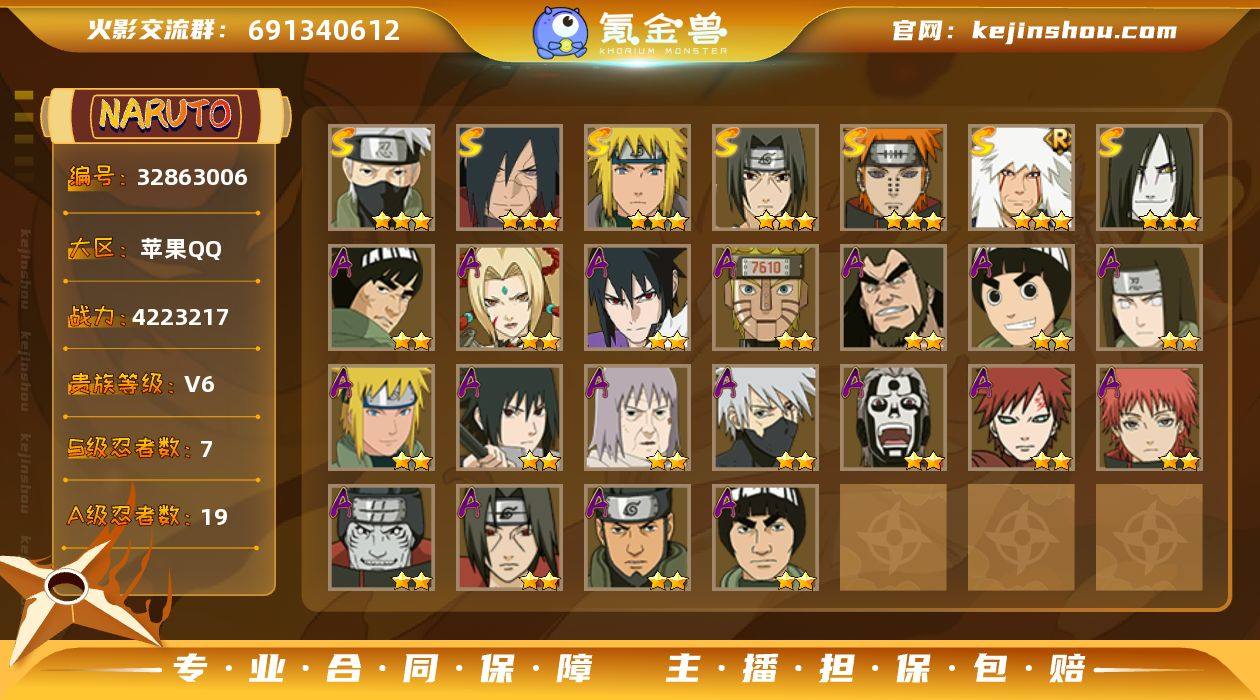 IOS/7S忍/19A忍/战力422W/V6/区服607 【S忍者】 宇智波斑「秽土转生·解」,自来也「舞之豪杰」,旗木卡卡西「须佐能乎」,宇智波鼬「须佐能乎」,佩恩「天道」,波风水门,大蛇丸, 【A忍者】 机械鸣人「初始形态」,纲手「妖怪奇谭」,迈特凯「青春爆炸」,宇智波佐助「侠隐江湖」,日向宁次「忍界大战」,李洛克「忍界大战」,神农「羁绊」,波风水门「青年」,宇智波佐助「须佐能乎」,千代「近松十人卫」,旗木卡卡西「万花筒写轮眼」,飞段「死司凭血」,我爱罗「疾风传」,蝎,干柿鬼鲛,宇智波鼬,猿飞阿斯玛,迈特凯, PX_2335547