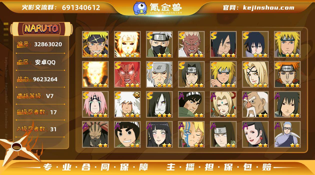 17S忍/31A忍/战力962W/V7/区服1979 【S忍者】 宇智波佐助「漩涡鸣人」,艾「忍界大战」,宇智波斑「秽土转生·解」,宇智波佐助「永恒万花筒」,春野樱「忍界大战」,漩涡鸣人「九喇嘛连结」,迈特凯「死门」,自来也「舞之豪杰」,旗木卡卡西「须佐能乎」,千手扉间「秽土转生」,纲手「百豪」,波风水门「秽土转生」,宇智波鼬「须佐能乎」,佩恩「天道」,波风水门,大蛇丸,波风水门「九喇嘛连结」, 【A忍者】 大野木「侠隐江湖」,纲手「妖怪奇谭」,迈特凯「青春爆炸」,长十郎「六代目水影」,不缘,日向宁次「忍界大战」,漩涡博人「桃式显现」,日向雏田「最终章」,李洛克「忍界大战」,蝎「绯流琥」,宇智波泉奈,长门「青年」,艾「青年」,波风水门「青年」,宇智波佐助「须佐能乎」,迪达拉「秽土转生」,千代「近松十人卫」,秋道丁次「忍界大战」,大蛇丸「晓」,照美冥「五代目水影」,宇智波佐助「万花筒写轮眼」,漩涡鸣人「仙人模式」,飞段「死司凭血」,飞段,迪达拉,我爱罗「疾风传」,蝎,干柿鬼鲛,宇智波鼬,猿飞阿斯玛,迈特凯, PX_2332342