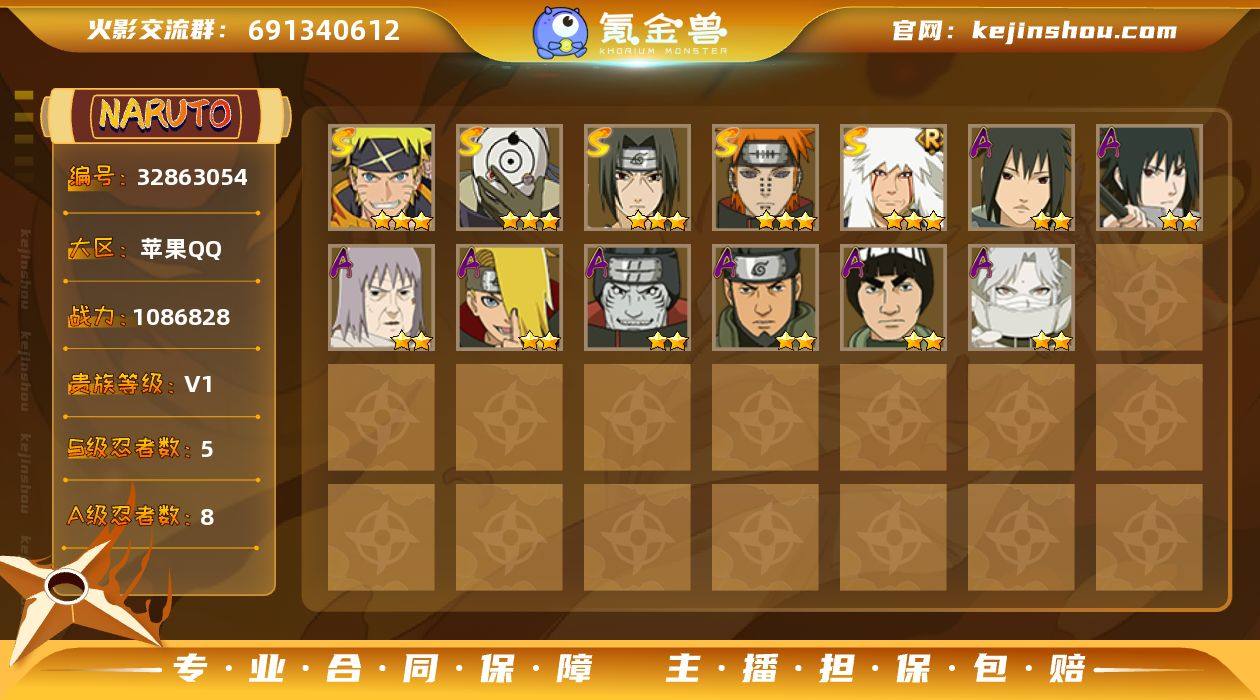 IOS/5S忍/8A忍/战力108W/V1/区服844 【S忍者】 宇智波佐助「漩涡鸣人」,自来也「舞之豪杰」,宇智波斑「白面具」,宇智波鼬「须佐能乎」,佩恩「天道」, 【A忍者】 宇智波泉奈,宇智波佐助「须佐能乎」,千代「近松十人卫」,迪达拉,干柿鬼鲛,猿飞阿斯玛,迈特凯,卑留呼「火之意志继承者」, PX_2314699