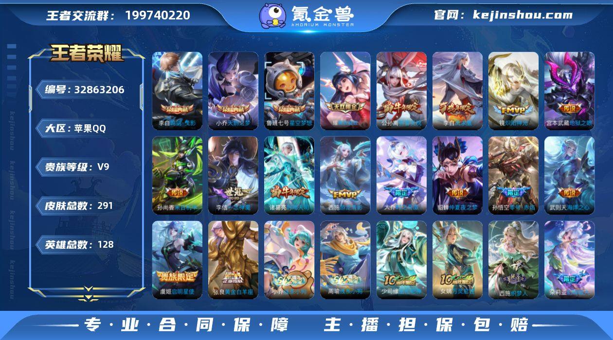 实名: 可修改 性别: 女号 贵族等级: V9 英雄数: 128 皮肤数: 291 荣耀水晶: 天鹅之梦,星空梦想,鸣剑·曳影 无双皮: 真我赫兹(瑶) 传说皮: 黄金白羊座,炽阳神光,一念神魔,末日机甲-孙尚香,仲夏夜之梦,零号·赤焰,海洋之心,地狱之眼,游龙清影,大乔-时之奇旅 限定皮: 冰锋战神,遇见飞天,李小龙,奔雷神使,祈雪灵祝,游园惊梦,梁祝,御风骁将,时雨天司,引擎之心,白晶晶,虎魄,神威,蜜橘之夏,幽恒,飞衡,天狼狩猎者,冰霜恋舞曲,逐梦之影,凤求凰,美猴王,如梦令-后羿,大圣娶亲,默契交锋-花木兰 亮点: 【优质装备】:天鹅之梦(小乔典藏),星空梦想(太空人),鸣剑·曳影,真我赫兹(瑶)(瑶无双),黄金白羊座,炽阳神光,一念神魔,末日机甲-孙尚香(绿蚂蚱),仲夏夜之梦(大飞蛾),零号·赤焰,海洋之心,地狱之眼,游龙清影(小青龙),大乔-时之奇旅