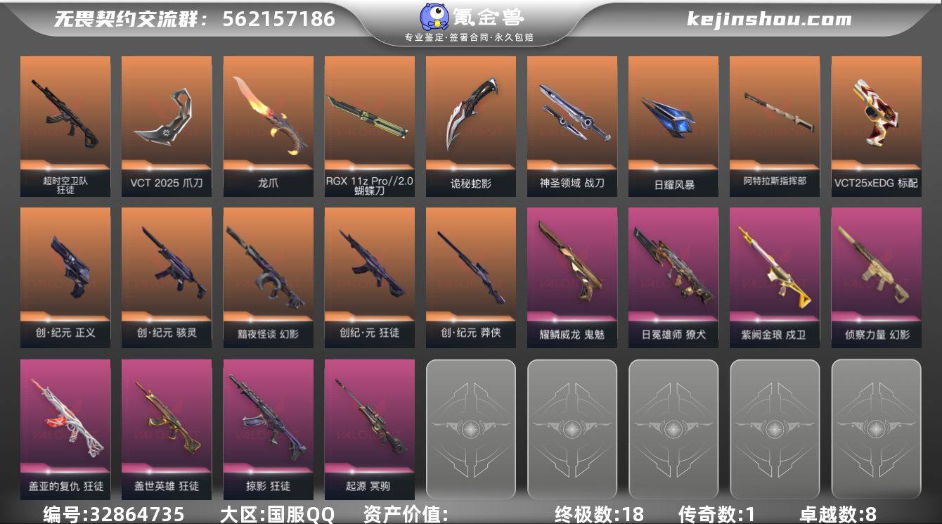 【945254】【套装】:VCT 2025 赛季套装,创·纪元套装 【英雄】:幻棱,炼狱,维斯,暮蝶,钛狐,壹决,铁臂,捷风,雷兹,幽影,不死鸟,贤者,猎枭,蝰蛇,零,芮娜,奇乐,尚勃勒,霓虹,斯凯,夜露,星礈,K/O,盖可,黑梦 【近战武器】:近战武器-RGX 11z Pro//2.0 蝴蝶刀,近战武器-剥皮小刀,近战武器-VCT 2025 爪刀,近战武器-紫金爪刀,近战武器-黑波之刃,近战武器-镭切,近战武器-未来开拓者,近战武器-龙爪,近战武器-诡秘蛇影 军刀,近战武器-神圣领域 战刀,近战武器-日耀风暴 遗器,近战武器-阿特拉斯指挥部 甩棍 【狂徒】:狂徒-创·纪元,狂徒-超时空卫队,狂徒-掠影,狂徒-盖世英雄,狂徒-盖亚的复仇,狂徒-诡秘蛇影 【幻影】:幻影-黯夜怪谈,幻影-侦察力量,幻影-神圣领域,幻影-末日之翼 【戍卫】:戍卫-紫阙金琅,戍卫-月球哨兵,戍卫-折光棱晶 【獠犬】:獠犬-日冕雄师,獠犬-神圣领域 【冥驹】:冥驹-起源,冥驹-星云暗涌 【飞将】:飞将-末日之翼 【莽侠】:莽侠-创·纪元,莽侠-诡秘蛇影,莽侠-月球哨兵 【战神】:战神-神圣领域 【奥丁】:奥丁-末日之翼 【判官】:判官-诡秘蛇影 【雄鹿】:雄鹿-月球哨兵 【骇灵】:骇灵-创·纪元,骇灵-星云暗涌 【...