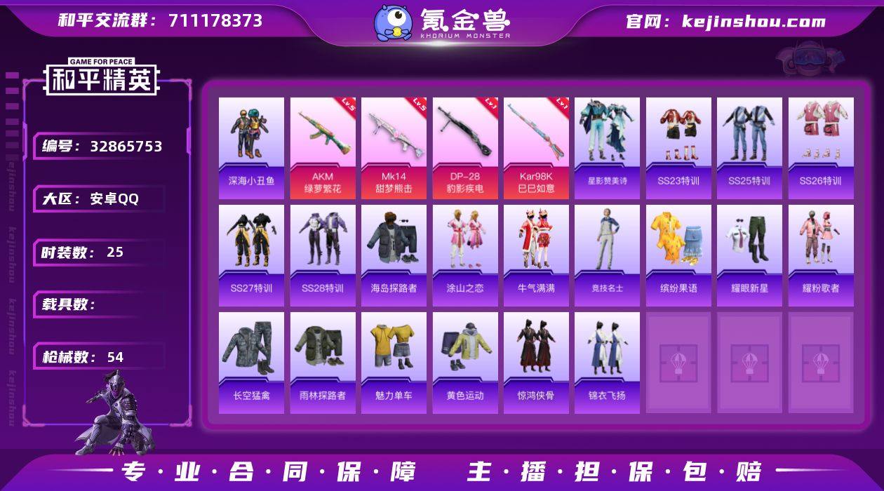 安卓【小号 套装-深海小丑鱼,M416-星际漫游,AKM-绿萝繁花(五级),Mk14-甜梦熊击(五级)】 手Q-0粉装-4特效枪-0载具-0粉色飞行器-12920热力值-1王牌印记-25套装-54枪皮 【热门品类】:套装-深海小丑鱼,M416-星际漫游 【粉色枪皮等级】:AKM-绿萝繁花(五级),Kar98K-巳巳如意(一级),Mk14-甜梦熊击(五级),DP-28-豹影疾电(一级) 【粉色枪皮】:AKM-绿萝繁花,Kar98K-巳巳如意,Mk14-甜梦熊击,DP-28-豹影疾电 【粉色降落伞】:忍者神龟降落伞 【稀有套装】:套装-星影赞美诗 【稀有枪皮】:AKM-彩虹符号,AKM-破晓战魂,M16A4-星际漫游,SCAR-L-黄金龙骨,M416-星际漫游,M416-糯团青竹,M416-蓝色火焰,GROZA-影袭,AUG-天降萌叽,QBZ-彩虹符号,G36C-星际漫游,G36C-星穹咏叹调,AC-VAL-闲梦青缨,UMP45-星际漫游,UMP45-炫光之旅,Vector-生命誓言,Kar98K-星穹咏叹调,VSS-星之彼岸,Mini14-星际漫游,M417-惊鸿侠骨,M200-惊鸿侠骨,S686-生命誓言,DBS-彩虹符号,M249-彩虹符号,MG3-惊鸿侠骨,R45-幻彩电音,爆炸猎弓-惊鸿侠骨,破片手榴弹-巳巳如意 【其他套装】:套装-SS23特训,套装-SS25特训,套装-SS26特训,套装-SS27特训,套装-SS28特训,套装-海岛探路者,套装...