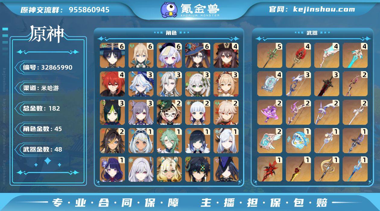 邮箱: 送网易邮箱 总黄数: 182 冒险等级: 60 6命金色角色: 满命七七,满命莫娜,满命琴,满命流浪者 4命金色角色: 四命迪卢克,四命胡桃 3命金色角色: 三命宵宫,三命刻晴,三命提纳里,三命纳西妲,三命那维莱特,三命芙宁娜 2命金色角色: 二命枫原万叶,二命神里绫华,二命迪希雅,二命艾梅莉埃 1命金色角色: 一命雷电将军,一命申鹤,一命夜兰,一命白术,一命玛拉妮 0命金色角色: 温迪,优菈,可莉,达达利亚,钟离,阿贝多,甘雨,魈,珊瑚宫心海,荒泷一斗,八重神子,神里绫人,赛诺,妮露,艾尔海森,林尼,娜维娅,闲云,千织,阿蕾奇诺,克洛琳德,基尼奇,希诺宁,丝柯克 拥有武器: 狼的末路,天空之翼,雾切之回光,飞雷之弦振,四风原典,天空之卷,和璞鸢,阿莫斯之弓,风鹰剑,天空之刃,无工之剑,贯虹之槊,磐岩结绿,护摩之杖,松籁响起之时,薙草之稻光,不灭月华,苍古自由之誓,终末嗟叹之诗,冬极白星,息灾,赤角石溃杵,神乐之真意,波乱月白经津,若水,猎人之径,赤沙之杖,圣显之钥,千夜浮梦,图莱杜拉的回忆,裁叶萃光,碧落之珑,最初的大魔术,万世流涌大典,静水流涌之辉,裁断,有乐御簾切,赤月之形,赦罪,柔灯挽歌,冲浪时光 5精武器: 和璞鸢 4精武器: 天空之翼,四风原典,天空之刃,护摩之杖 3精武器: 狼的末路,若水 2精武...