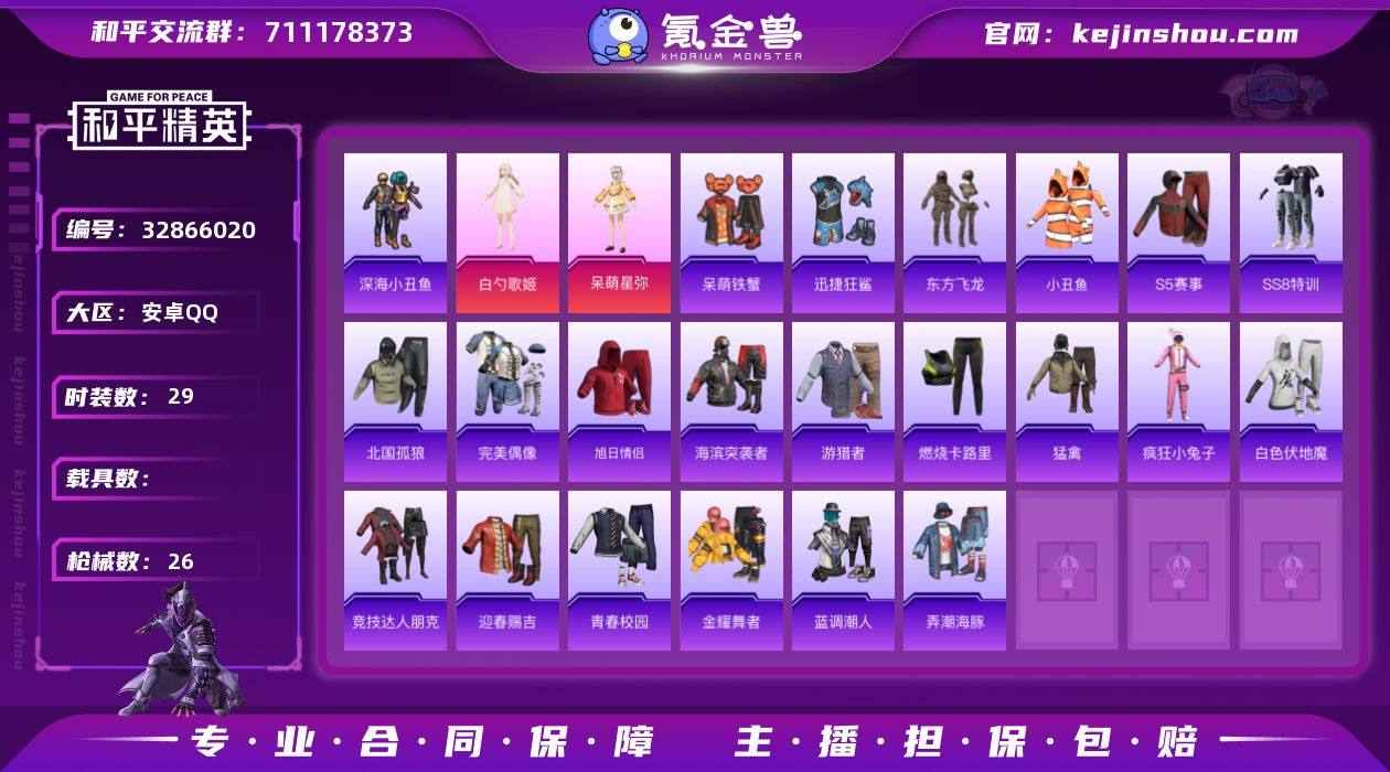 安卓【小号】 手Q-2粉装-1特效枪-0载具-0粉色飞行器-7882热力值-1王牌印记-29套装-26枪皮 【热门品类】:套装-深海小丑鱼,套装-小丑鱼 【粉色套装】:角色-白勺歌姬,角色-呆萌星弥 【粉色枪皮等级】:Mk14-福马献瑞(一级) 【粉色枪皮】:Mk14-福马献瑞 【粉色降落伞】:幻影战神降落伞,白勺歌姬降落伞 【稀有套装】:套装-雨过天青,套装-红釉青花 【稀有枪皮】:AKM-缤纷海域,SCAR-L-生命誓言,M416-红色方程式,GROZA-春暖花开,GROZA-生命誓言,M762-奇异狩猎者,M762-绯红前夜,UZI-生命誓言,汤姆逊-像素花束,M24-奇异狩猎者,SKS-炫彩节奏,SKS-迅猛狂鲨,Mini14-生命誓言,Mini14-穿刺龙虾,S686-奇异狩猎者,DBS-圣堂之誓 【其他套装】:套装-S5赛事,套装-SS8特训,套装-北国孤狼,套装-完美偶像,套装-旭日情侣,套装-海滨突袭者,套装-游猎者,套装-燃烧卡路里,套装-猛禽,套装-疯狂小兔子,套装-白色伏地魔,套装-竞技达人朋克,套装-迎春赐吉,套装-青春校园,套装-金耀舞者,套装-蓝调潮人,套装-深海小丑鱼,套装-呆萌铁蟹,套装-迅捷狂鲨,套装-弄潮海豚,套装-东方飞龙 【稀有头盔】:幻影战神头盔(3级),幻影战神头盔(2级),幻影战神头盔(1级),金风...