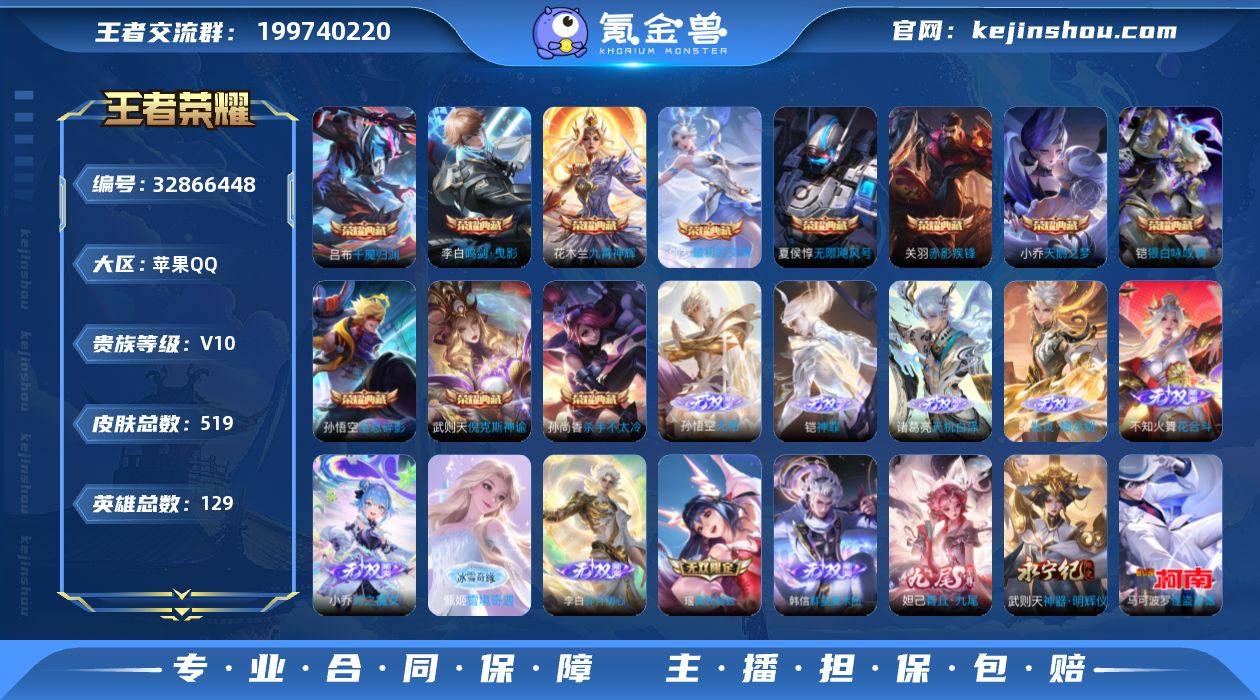 苹果Q-V10-至尊星耀I段位-129英雄-519皮肤-11典藏皮肤-1典藏英雄-12无双-4珍品传说-75传说-150史诗 【英雄全皮】:廉颇全皮,夏侯惇全皮,武则天全皮,孙权全皮,不知火舞全皮,娜可露露全皮,橘右京全皮,苍全皮,铠全皮,狂铁全皮,盾山全皮,猪八戒全皮,曜全皮,夏洛特全皮,司空震全皮,金蝉全皮,戈娅全皮,空空儿全皮,少司缘全皮 【荣耀典藏】:武则天英雄,孙悟空全息碎影,武则天倪克斯神谕,夏侯惇无限飓风号,小乔天鹅之梦,孙尚香杀手不太冷,李白鸣剑曳影,花木兰九霄神辉,关羽赤影疾锋,铠银白咏叹调,伽罗最初的交响,吕布千魇归渊 【无双皮肤】:孙悟空无相,铠神罪,诸葛亮天机白泽,曜器灵螭龙剑,甄姬雪境奇遇,不知火舞花合斗,韩信群星魔术团,小乔时之魔女,李白碎月剑心,瑶真我赫兹,妲己青丘九尾,武则天神器明辉仪 【珍品传说】:嫦娥器灵落星盏,孙策时之奇旅,鲁班七号江户川柯南,马可波罗怪盗基德 【传说皮肤】:后羿神树通天,司马懿九山相柳,后羿千劫归真,司空震愿照山河定,女娲愿照千秋盛,妲己愿照众生和,澜愿照九州拓,蔡文姬愿照福禄聚,虞姬愿照岁时盈,云缨幻光神枪,桑启鸣野蒿,庄周牧神诗旅,夏侯惇霜北刀,铠冥王哈迪斯,云...