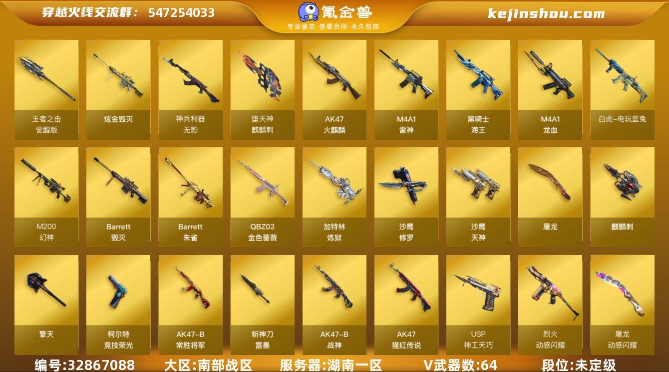 湖南一区-65V-6王者-1炫金 【热门武器】:QBZ03-金色蔷薇,M200-幻神,白虎-电玩蓝兔,加特林-炼狱,沙鹰-修罗*4,金刚伞 【王者炫金武器】:炫金毁灭 【音效卡】:M200-幻神音效卡,M4A1-雷神音效卡,Barrett-毁灭音效卡,绝迹语音包 【皮肤】:幻神-宠儿-2021MVP,幻神-巅峰荣耀,M200-幻神-N9-2022MVP,QBZ03-荣耀世冠白鲨,雷神-暗月,雷神-荣耀之魄,雷神-荣耀世冠AG,火麒麟-雷神,火麒麟-轻羽皮肤,传奇石头-横秒之巅,火麒麟-平天大圣,火麒麟-荣耀世冠AG,毁灭-冠军之怒,毁灭-BEAN-2020MVP,战神-粉色甜心皮肤,战神-流金岁月皮肤*2,AK47-B-常胜将军-曹操,AK47-B-常胜将军-孙权,极光-高能霹雳 皮肤,炼狱-星空,屠龙-荣耀之锋*2 【角色】:影豹,王者春,王者涂鸦,乔伊教练,暗夜-X,初恋灵狐,嘉年华灵狐,兰-新年限定,灵狐-花神,潘多拉-X,蜀雪,铁骑荣耀,新娜塔莎,职业选手 【人偶武器】:AWM-灵狐-15周年嘉年华,迷你深渊冰龙,闪光弹-小乔,闪光弹-貂蝉,高爆手雷-大乔,迷你超能女侍 【暴走生化】:超级对讲机 【挑战大师】:神圣爆裂者-末日III*2,阐释者III 【英雄级武器】:AK47-火麒麟,M4A1-雷神,M4A1-龙血,无影-神兵利器,QBZ03-金色蔷薇,烈...