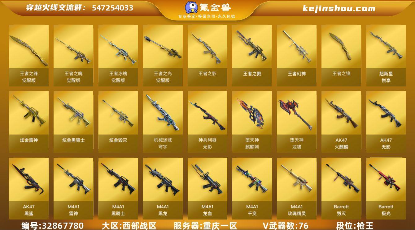 【ky6563】重庆一区-86V-11王者武器数-5炫金武器数 【热门武器】:王者幻神,QBZ03-金色蔷薇,Kar98K-星神,M4A1-黑骑士,RPK-盘龙*2,加特林-炼狱*2,COP-白鲨,沙鹰-修罗*5,金刚伞 【王者炫金武器】:王者之戮,超新星-悦享*2,王者之影,王者幻神,王者之锋,炫金骑士*2,炫金雷神,炫金毁灭*2 【音效卡】:AK47-火麒麟音效卡,M4A1-雷神音效卡,M4A1-黑龙音效卡,M4A1-黑骑士音效卡,Barrett-毁灭音效卡 【皮肤】:雷神-暗月,火麒麟-华夏之心,火麒麟-心动糖果,毁灭耀金皮肤*2,毁灭-英雄计划 皮肤,黑龙-能量核心,黑龙-暗月*2,黑骑士-暗月,无影-能量核心,战神-粉色甜心皮肤*2,战神-紫绶金章皮肤*4,战神-流金岁月皮肤*2,AWM-天龙-传奇白鲨,极光-能量核心 【角色】:樱,王者春,幻面灵狐,风暴女,嘉年华灵狐,娟娟,零-水下丽影,龙儿-小淘气,潘多拉-甜心教官,斯沃特-X 【人偶武器】:COP-白鲨,AWM-灵狐-15周年嘉年华,迷你生化手雷,深渊终结者手雷,闪光弹-小乔,迷你艾比 【英雄级武器】:M4A1-千变,AK47-火麒麟*2,M4A1-黑龙*2,M4A1-雷神,M4A1-黑骑士,AK47-无影*4,AK47-黑鲨*2,M4A1-龙血*2,无影-神兵利器,M4A1-玫瑰精灵,QBZ03-金色蔷薇,9A91...