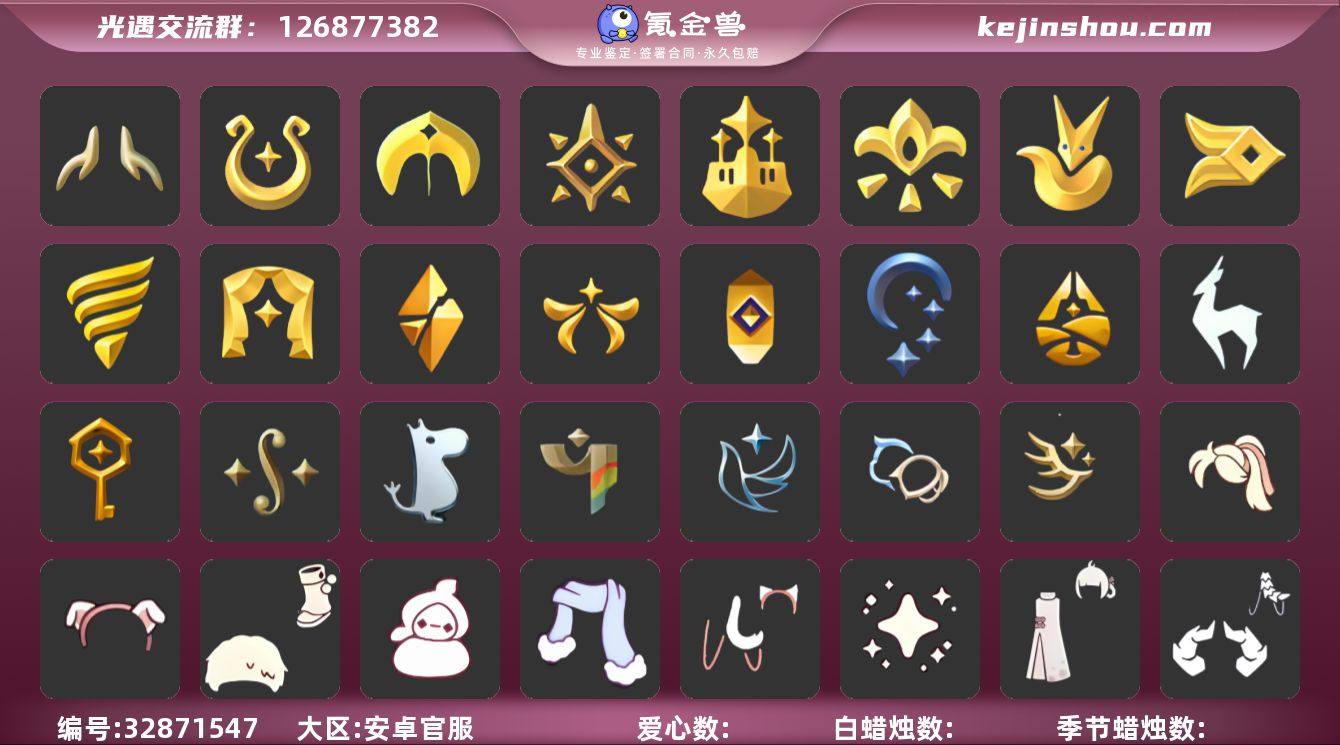 账号类型: 手机账号 季节已毕业: 魔法季,圣岛季,预言季,梦想季,小王子季,风行季,潜海季,表演季,破晓季,欧若拉季,集结季,夜行季,追忆季,归巢季,九色鹿季,筑巢季,二重奏季,姆明季,彩染季,青鸟季,双星季,迁徙季,织光季 完成地图: 晨岛,云野,雨林,霞谷,暮土,禁阁,全图毕业 珍稀物品: 阿努比斯(狗头),白枭,透明蝶翼斗,魔法季耳坠,玫瑰花 礼包: 蝙蝠套,巫师,围巾,星球斗,小狐狸,欧若拉之翼,九色鹿角,莲花斗,音乐桌,大耳狗抱枕,大耳狗装扮,绊爱,大铁头,鹿角,荷叶伞,蜘蛛斗,牛仔裤,兔子鞋,大耳狗发饰,秋千,茶桌,茶壶,餐桌,白绒金,瑞雪,女巫裙,福娃,跷跷板,小船,吉他,灯笼,风之旅人,人声乐器,鲤鱼套,雪花球,橘子,贝壳,黄伞,红伞,兔子,南瓜,枯角,雪花,鲤鱼,竖琴,手碟,tgc,水母,猫套,猫背饰,星月头饰,彩虹耳钉,彩虹耳机,新年裤,蝴蝶结,魔法棒,奥利奥,海螺,四叶草,暗彩装扮,小提琴,爱心眼镜,火焰眼镜,伯爵斗篷,透明蛛丝,伯爵面具,雪人鞋,新年耳钉,浪漫流星斗,创始人,海蓝波浪发型,日光耳环,满月耳坠,月华套装,恶作剧飞行扫帚,蛛网朋克,龙鳞束身长袍,海龟斗篷,衔福献瑞礼包,献瑞折扇礼包,小狗周年发饰,篝火点心礼包,奉献斗篷,风之旅人白袍,青衫落拓礼包,线框斗篷礼包,缤纷飘带斗篷礼包,小...