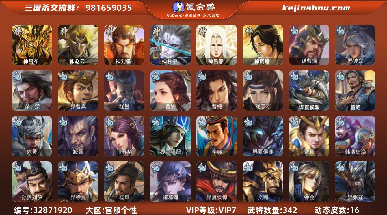 VIP等级: VIP7 官阶: 骠骑将军 武将数量: 342 动态皮肤数量: 16 神将: 神甘宁,神刘备,神吕布,神赵云,神吕蒙,神周瑜 魏国武将: 戏志才,曹纯,曹婴,程昱,界曹真,界于禁,界钟会,谋曹操,唐咨-魏,张辽,SP蔡文姬,SP曹仁,SP关羽,SP贾诩,SP姜维,SP庞德,蔡贞姬,曹昂,曹操,曹冲,曹洪,曹丕,曹仁,曹叡,王异,鲁芝,界满宠,界曹植,满宠,荀攸,王基,钟繇,蒯越蒯良,郭嘉,荀彧,界郭嘉,崔琰,界曹丕,界荀彧,朱灵,界甄姬,吕虔,界王异,界许褚,界郭淮,陈群,界邓艾,界曹休,袁涣,乐进,辛宪英,郭淮,郭皇后,夏侯惇,曹植,司马朗,谋于禁,界曹操,许褚,界张辽,谋徐晃,钟会,文聘,曹彰,界夏侯惇,诸葛诞,司马懿,甄姬,杨阜,界徐晃,徐晃,孙资刘放,韩浩史涣,曹真,典韦,界夏侯渊,夏侯渊,李典,于禁,邓艾,界司马懿,张春华,臧霸,朱灵(国战),董昭,谋夏侯渊 蜀国武将: 花鬘,界黄忠,谯周,沙摩柯,王平,赵襄,诸葛瞻,谋马超,谋赵云,谋黄月英,徐庶,界魏延,杨仪,界关羽,界诸葛亮,邓芝,界伊籍,费祎,界张嶷,赵云,张松,彭羕,界刘备,谋姜维,刘封,糜竺,谋庞统,黄月英,关羽,王甫赵累,吴懿,界吴懿,界廖化,向宠,张飞,黄皓,魏延,界法正,糜夫人,界孟获,刘禅,界赵云,界姜维,张翼,关银屏,界祝融,SP孙尚香,SP徐庶,卧龙诸葛,宗预,周仓,简雍,界关...