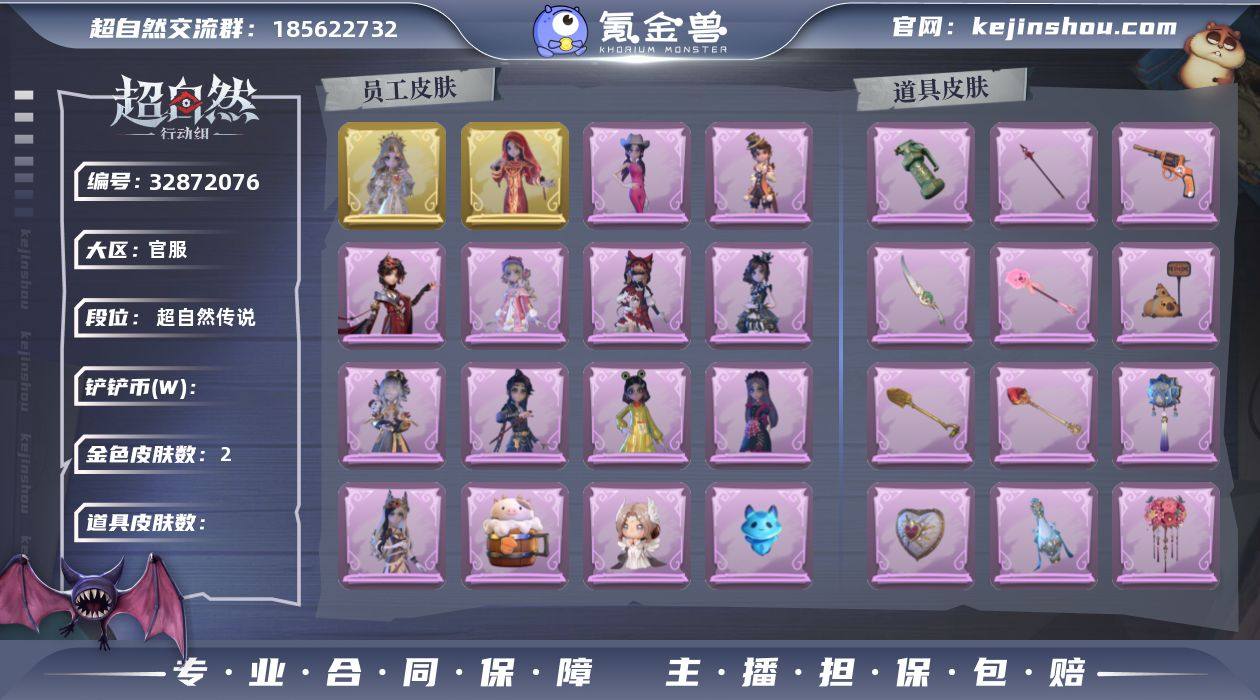 【账号已绑定信息】:邮箱 【耀世皮肤】:薇薇安-圣光之谕,巫铃儿-镜花辞 【典藏皮肤】:小黄-异色序曲,小黄-呱呱雨衣,爱丽丝-耀眼的你,爱丽丝-甜梦派对,爱丽丝-丝缕哀歌,阿念-庆宴绮愿,逍遥-绣春逍影,薇薇安-仙锋小姐,薇薇安-白光莹,莉莉-莓果陷阱,莉莉-除妖小师妹 【道具皮肤】:铲子-赞萌波板糖,铲子-龙鳞,铲子-圣心之泪,铲子-卡皮巴拉小黄豚铲,腰包-月下莲台,腰包-宝剑八,额外的背包-飞花令,长枪-罪棘,黄牛能量饮料-青玉抱丹,夜视仪-金丝眼镜,音响-鸣沙鼓,音响-happy猫,刺刀-碧络琅环,喷气背包-乘风溯雪,转轮手枪-新星时代,急救包-蔷薇物语,闪光弹-金戈玄铜 【金色动作】:新年摇,金城舞,九万字舞,不孬摇,知世摇,luvaboy,舞台中心,心跳摇,小雨摇 【紫色动作】:拜年,旋转舞,带你逃跑吧,要糖,举牌,KT猫摇,抬手 【美妆】:暗夜小恶魔 【背饰】:牛啤背包,炽天使的余烬,天使的呼唤,潮汐小海兔,云梦之星,小小罗丽,绒团小狐狸 【挂饰】:不朽的今夜,晚安小熊,钗头凤,天使消失的年代 【工牌动作】:轻躯鹤立,净禅,虔诚之姿 【员工】:月,临云,兰,小满,爱德华,艾伦,莉莉,巫铃儿,薇薇安,逍遥,阿念,零,小黄,爱丽...