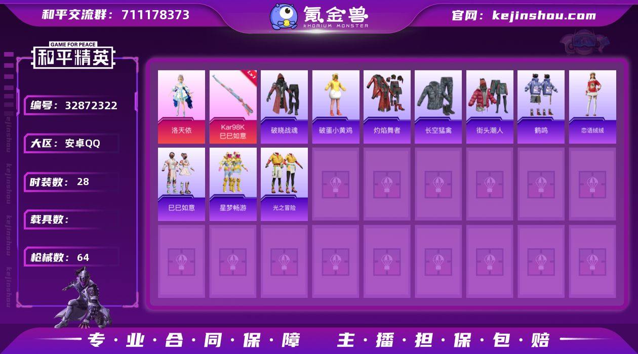 QY468 极品女号 洛天依 三体号 王者15传说172皮 至尊宝 使命1神话12传说 2太阳 地铁天赋5级 安卓Q区-1粉装-4特效枪-14630热力值-1王牌印记-28套装-64枪皮【优质套装】: 洛天依【特效枪等级】:Kar98K-巳巳如意(五级- Kar98K-巳巳如意)【优质武器皮肤】: Kar98K-巳巳如意【稀有武器皮肤】: DBS-乌木金纹 Kar98K-巳巳如意 PKM-啾咪啾咪 M416-红色方程式 AKM-龙的传人 SCAR-L-炫彩节奏 M16A4-幻世战舞者 AUG-耀粉歌者 M762-天降萌叽 AC-VAL-天降萌叽 M24-炫彩节奏 AWM-天降萌叽 SKS-糯团青竹 Mini14-耀粉歌者 UZI-天降萌叽 UZI-啾咪啾咪 UMP45-蓝色火焰 UMP45-夜灯 S686-红色方程式 S686-生命誓言 S12K-破晓战魂 S12K-夜灯 M249-破晓战魂 M249-星之彼岸 DP-28-彩虹符号 MG3-幻世战舞者 平底锅-光之冒险 M200-乌木金纹 VSS-香桃花海 P90-巳巳如意 破片手榴弹-巳巳如意【其他套装】: 洛天依 恋语绒绒 战术大师 巳巳如意 长空猛禽 街头潮人 灼焰舞者 破蛋小黄鸡 破晓战魂 光之冒险 鹤鸣 星梦畅游【优质飞行器】: 炫彩糖果飞行器【优质降落伞】: 喜羊羊与灰太狼降落伞 炫彩糖果降落伞 2023祥云降落伞 普通降落伞 鬼刀降落伞 海域冒险降落伞 冰河战士降落伞 星之彼岸降落伞