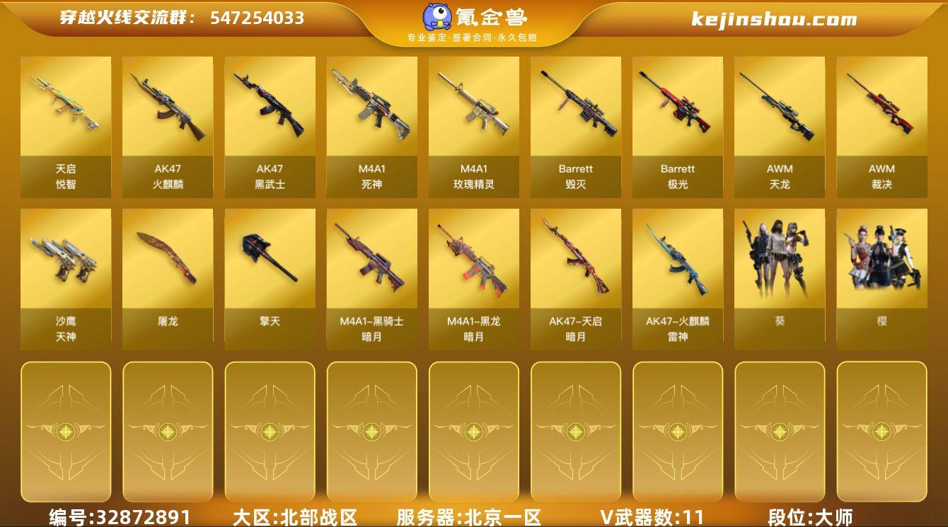 【ky5458】北京一区-13V-1王者武器数-0炫金武器数 【热门武器】:死亡之眼*3 【王者炫金武器】:天启-悦智 【皮肤】:火麒麟-雷神,黑龙-暗月,黑骑士-暗月,天启-暗月,天神-暗月 【角色】:葵,樱,北极狐-X,新娜塔莎,影武者-X 【暴走生化】:死亡之眼*3 【挑战大师】:激光毁灭者III,阐释者III 【英雄级武器】:AK47-火麒麟,M4A1-死神,AK47-黑武士,M4A1-玫瑰精灵,AWM-天龙,Barrett-毁灭,Barrett-极光,AWM-裁决,沙鹰-天神,屠龙,擎天 【道具】:CFS限定背包,战舰背包,炫彩背包,绿色巨人,灵魂忍者,迷雾幽灵,夺命之镰,防化服*2,枪王排位28赛季金色流光,枪王排位29赛季金色流光,EP战队击杀图标,防弹头盔*2,防弹衣*2,C4工具钳*2,手雷包*2 【特殊枪械】: