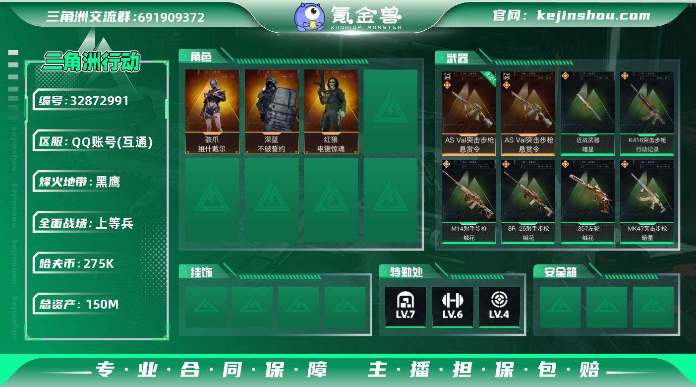 【sjs9933】包人脸 可秒改 玩够能回血 1典藏 1刀皮1红皮带4级处刑者悬赏令优品c 烽火地带段位: 黑鹰 全面战场段位: 上等兵 总资产: 150000000 哈夫币: 275000 sjs9933 干员外观: 深蓝-不破誓约(S6),骇爪-维什戴尔,红狼-电锯惊魂 传说武器皮肤: M4A1突击步枪-蚀金玫瑰,M4A1突击步枪-阿米娅,M250通用机枪-骑士之心,R93狙击步枪-维什戴尔,SCAR-H战斗步枪-启航,ASh-12战斗步枪-鹅鸭杀,QCQ171冲锋枪-鹅鸭杀,QJB201轻机枪-鹅鸭杀,G3战斗步枪-骑士,KC17突击步枪-电锯惊魂,近战-暗星,MK47突击步枪-暗星,SR-3M紧凑突击步枪-暗星,K416突击步枪-行动记录,.357左轮-缄花,SR-25射手步枪-缄花,M14射手步枪-缄花 史诗武器皮肤: SVD狙击步枪-阿萨拉工艺,M700狙击步枪-蝮蛇,PKM通用机枪-蝮蛇,M250通用机枪-囚徒,AWM狙击步枪-无极限,ASh-12战斗步枪-无极限,Mini-14射手步枪-守护者,K437突击步枪-守护者,复合弓-守护者,MP7冲锋枪-守护者,腾龙突击步枪-猎鳄行动,SV98狙击步枪-猎鳄行动,勇士冲锋枪-工业狂潮,MP5冲锋枪-战术竞备,M700狙击步枪-哈夫克警备,G3战斗步枪-哈夫克警备,MP5冲锋枪-竞技风,M14射手步枪-工业狂潮,SMG45冲锋枪-阿萨拉特攻,MP7冲锋枪-六套之力 载具皮肤: 防空车-凝视,突击直升机...