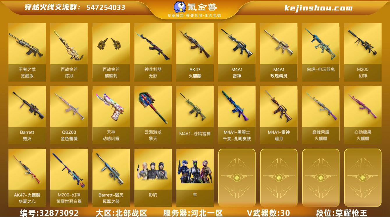 【ky5801】河北一区-35V-1王者武器数-0炫金武器数 【热门武器】:QBZ03-金色蔷薇,M4A1-青龙,M200-幻神,白虎-电玩蓝兔,COP-白鲨 【音效卡】:炼狱-百战金芒-庆典舞曲音效卡 【皮肤】:M200-幻神-荣耀世冠白鲨,幻神-动感闪耀 皮肤,幻神-电竞之星 皮肤,雷神-暗月,M4A1-再燃火线,雷神-神秘按键 皮肤,火麒麟-华夏之心,火麒麟-巅峰荣耀,火麒麟-心动糖果,毁灭-冠军之怒,M4A1-千变-孔明皮肤,轻型军用手斧-再燃火线 【角色】:影豹,隼,乔伊教练,云海玲珑,暗夜-X,风暴女,嘉年华灵狐,兰-海滩派对,灵狐-花神,灵狐者-X,灵狐者-七夕宝贝,麻雀,曼陀罗-X,曼陀罗-礼服,潘多拉-X,潘多拉-甜心教官,潜龙队-X,斯沃特-X,兔囡囡,雪莉杨-摸金校尉 【人偶武器】:COP-白鲨,AWM-灵狐-15周年嘉年华,迷你牛魔王,迷你波特博士,夺魂,迷你牛牛,生化手雷-机甲核心,深渊终结者手雷*2 【暴走生化】:超级对讲机 【挑战大师】:激光毁灭者III-白马银枪*3,神圣爆裂者-末日III 【英雄级武器】:AK47-火麒麟*2,M4A1-雷神,M4A1-青龙,无影-神兵利器,M4A1-玫瑰精灵,QBZ03-金色蔷薇,王者之武-觉醒版,白虎-电玩蓝兔,Barrett-毁灭,M200-幻神,炼狱-百战金芒,天神-动感...
