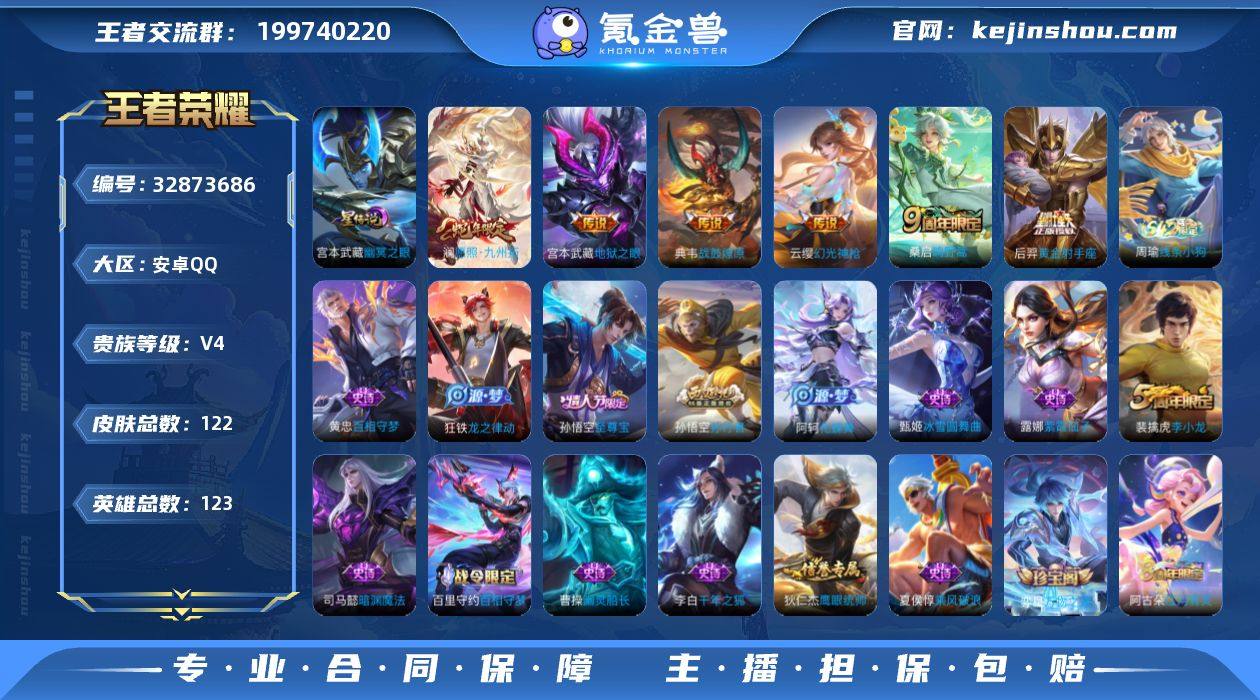 实名: 可修改 贵族等级: V4 英雄数: 123 皮肤数: 122 星传说: 幽冥之眼 传说皮: 黄金射手座,地狱之眼,典韦战鼓燎原,幻光神枪 限定皮: 李小龙,至尊宝,孙行者,鸣野蒿,愿照·九州拓 亮点: 账号亮点:澜愿照九州拓,云缨幻光神枪,桑启鸣野蒿,典韦战鼓燎原,后羿黄金射手座,宫本武藏地狱之眼 孙悟空至尊宝,孙悟空孙行者194【英雄全皮】:孙权全皮【传说皮肤】:澜愿照九州拓,云缨幻光神枪,桑启鸣野蒿,典韦战鼓燎原,后羿黄金射手座,宫本武藏地狱之眼【限定皮肤】:蒙犽顽岩魄,姜子牙天穹之誓,狄仁杰阴阳师,赵云皇家上将,狄仁杰魔术师,项羽海滩派对,孙悟空至尊宝,孙悟空孙行者,裴擒虎李小龙,鲁班大师探海日志,阿古朵江河有灵,张良古海寻踪,鬼谷子天穹祈灯,沈梦溪龙舞盛年,刘邦剑破天穹,周瑜熔金海岸【年限皮肤】:澜愿照九州拓【赛季限定】:鲁班大师探海日志,张良古海寻踪,鬼谷子天穹祈灯,刘邦剑破天穹,姜子牙天穹之誓,东皇太一噬灭天穹,太乙真人谧流熔炉,钟馗虚灵犬护,甄姬逆浪荇歌,亚瑟荣光之誓,牛魔星界战将【战令限定】:百里守约百相守梦,老夫子百相守梦,周瑜线条小狗【史诗皮肤】:周瑜线条小狗,黄忠百相守梦,狂铁龙之律动,阿轲化蝶舞...