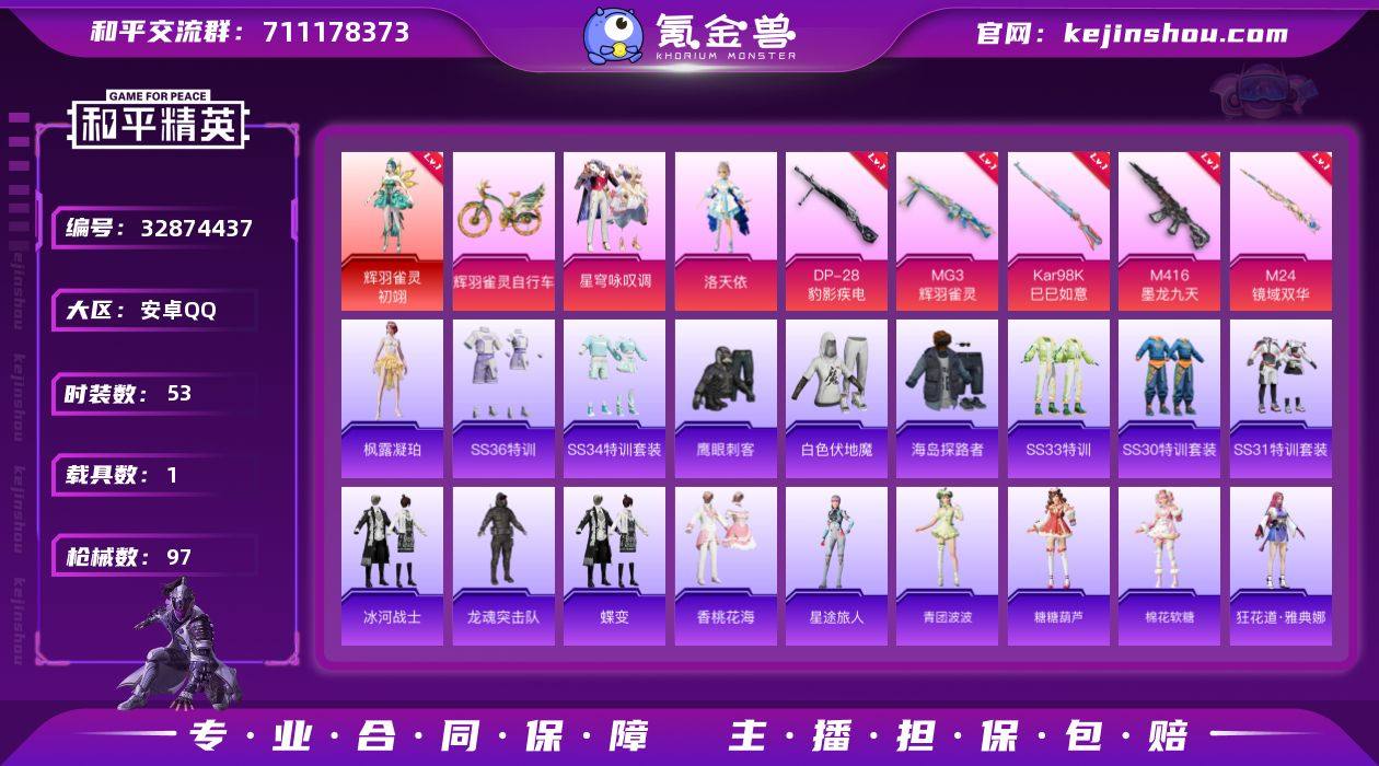 【3级红装5特效枪2粉装1载具 秒换绑不用等】 安卓Q区-32279热力值-53套装-97枪皮 【1红装】 辉羽雀灵-初翊(3级)【1载具】 辉羽雀灵自行车【1稀有】 Mark.06蓝螳螂【2粉装】 洛天依 星穹咏叹调【5特效枪】 M416-墨龙九天(3级) M24-镜域双华(3级) MG3-辉羽雀灵(1级) Kar98K-巳巳如意(5级) DP-28-豹影疾电(2级)【112热门】 白色伏地魔 SS27特训 Mk47-洛神天依 鹰眼刺客 M416-蓝色火焰 海岛探路者 纯真浪花 冰河战士 雏菊兔兔 恋语绒绒 SS34特训 星渊小夜曲 大橘大利 SS14特训 蓝冰羽 龙魂突击队 SS29特训 萝兰蝴蝶 SS30特训 青团波波 鱼渊荷华 糖糖葫芦 大砍刀-鬼刀 SS28特训 PKM-啾咪啾咪 石蕴玉辉 枫露凝珀 海盐绵绵冰 M16A4-冰河战士 燕燕于飞 SS31特训 SS33特训 SS32特训 巳巳如意 紫幽梦 R45-拳皇·狂花道 狂花道·娜可露露 棉花软糖 M762-雏菊兔兔 MG3-霓彩脉冲 Mini14-雏菊兔兔 R1895-雏菊兔兔 SS36特训 热情海星 Mk47-幻海仙踪 Vector-突变脉冲 智谋强哥 粉恋花 战术大师 狂花道·雅典娜 Kar98K-星穹咏叹调 短管霰弹-星穹咏叹调 AKS-74U-鬼刀 UMP45-海盐豹豹 MK20-H-星途旅人 AKS-74U-辉羽雀灵 M417-玩趣呆呆 许七安 AKM-荧星灵猫 Mk14-薄荷星砂 AUG-紫晶流影 PKM-紫幽梦 Mk...