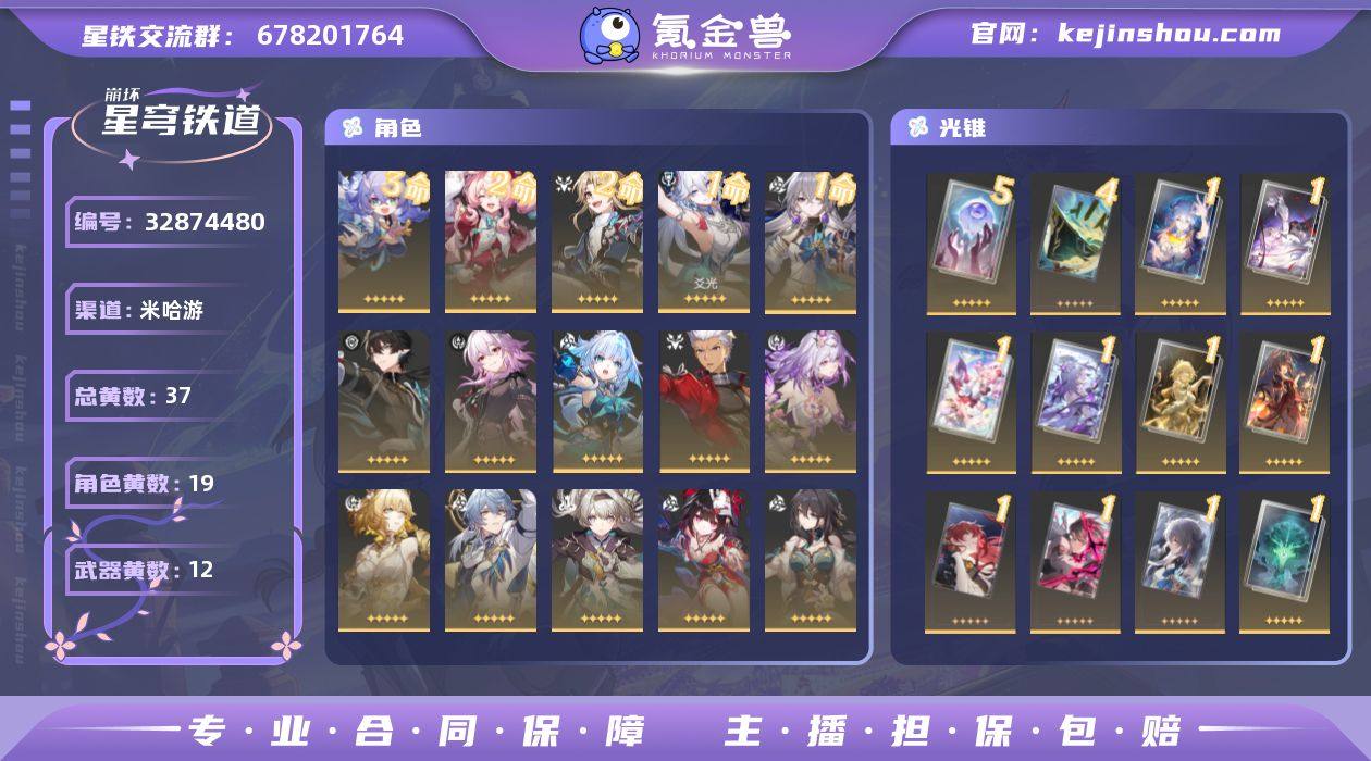 星琼数量: 96 总黄数: 37 五星光锥数: 12 五星角色数: 19 开拓等级: 70 开拓者性别: 男 3命金色角色: 3命白露 2命金色角色: 2命彦卿,2命风堇 1命金色角色: 1命布洛妮娅,1命爻光 0命金色角色: 0命瓦尔特,0命卡芙卡,0命符玄,0命托帕&账账,0命阮•梅,0命花火,0命流萤,0命星期日,0命阿格莱雅,0命遐蝶,0命Archer,0命刻律德菈,0命长夜月,0命丹恒·腾荒 精5武器: 精5记忆永不落幕 精4武器: 精4星海巡航 精1武器: 精1以世界之名,精1但战斗还未结束,精1银河铁道之夜,精1游戏尘寰,精1不息的演算,精1将光阴织成黄金,精1让告别,更美一些,精1愿虹光永驻天空,精1致长夜的星光,精1当她决定看见