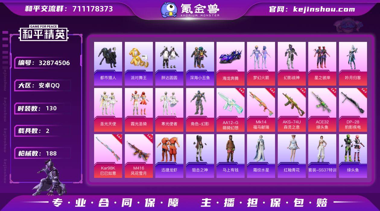 【都市猎人金鞋胖达圆圆7粉装7特效枪3载具 秒换绑不用等】 安卓Q区-59881热力值-130套装-188枪皮 【3载具】 兰博SUV黄色 海龙奔腾 空客蔚蓝之翼僚机【4稀有】 都市猎人 派对舞王(金靴子) 胖达圆圆卤蛋头 红眼罩【7粉装】 梦幻火箭 圣光天使 星之彼岸 寒光使者 霞光圣骑 吟月归客 幻影战神【7特效枪】 M416-风花雪月(7级) AKS-74U-森灵之息(5级) Mk14-福马献瑞(5级) AA12-G-萌骑幻想(3级) ACE32-绿头鱼(4级) Kar98K-巳巳如意(5级) DP-28-豹影疾电(5级)【191热门】 深海小丑鱼 胖达圆圆 暗影哥特(红眼罩) 浪漫天命 都市猎人(蓝口罩) 金羽特工 团圆交子 瑞龙福将 狂沙舞者 TianBa战队服 SS27特训 SS23特训 SS22特训 Mini14-梦幻火箭 SCAR-L-玉兔迎春 GROZA-田园牧歌 AUG-幻影战神 M762-天降萌叽 M762-彩虹符号 Mk47-乌木金纹 UMP45-蓝色火焰 M249-彩虹符号 MG3-幻世战舞者 AKM-虎虎生威 AKM-春暖花开 AKM-星之彼岸 梦魇先生 鹰眼刺客 M416-蓝色火焰 GROZA-蓝莓炮弹 破蛋小黄鸡 长空猛禽 虚音幻奏 甜心亚梦 甜蜜熊情侣 青涩时光 霓虹极客 魅力单车 拉斐尔 漫步者 黑色伏地魔 粉红小猪 M762-瑞龙福将 汤姆逊-智耀战神 AA12-G-雨过天青 沙漠之鹰-雨过天青 Mini14-绯穹魔姬 情公主...