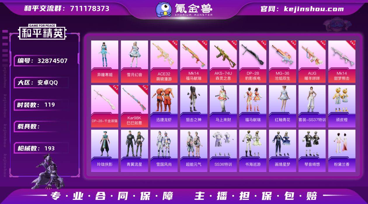 【9特效枪2粉装 秒换绑不用等】 安卓Q区-47293热力值-119套装-193枪皮 【2粉装】 雪月幻音 角色-异瞳寒姬【9特效枪】 AKS-74U-森灵之息(5级) Mk14-福马献瑞(5级) ACE32-萌骑漫游(2级) DP-28-千金淑猫(4级) Kar98K-巳巳如意(5级) Mk14-甜梦熊击(5级) AUG-暖羊咩咩(5级) DP-28-豹影疾电(5级) MG-36-沧焰双生(5级)【219热门】 浪漫天命 白色伏地魔 SS26特训 SS25特训 SS24特训 SS23特训 SS22特训 M762-天降萌叽 M762-彩虹符号 UMP45-蓝色火焰 DBS-彩虹符号 M249-彩虹符号 MG3-幻世战舞者 M416-蓝色火焰 GROZA-彩虹符号 破蛋小黄鸡 长空猛禽 特训学院 青涩时光 青年教官 魅力单车 猎鹰 蓝色运动 橘黑制服 竞技达人朋克 黄色运动 黄色伏地魔 红色运动 黑色伏地魔 海岛探路者 春日漫步 S1897-糯团青竹 AA12-G-雨过天青 沙漠之鹰-雨过天青 平底锅-画境星梦 超感刻度 P90-紫矿核心 GROZA-紫矿核心 玲珑侠影 M16A4-雨过天青 AC-VAL-玩趣呆呆 顶瓜瓜 SPAS-12-福马献瑞 M249-无面战甲 Vector-荒原烈焰 雨过天青 MG-36-薄荷星砂 GROZA-福马献瑞 恋语绒绒 SS34特训 漫游都市 朱霞炽焰 蜜獾-鸡智如我 星影赞美诗 撬棍-冰晶雪宝 AWM-天降萌叽 福马献瑞 大橘大利 超能元气 彩虹兔 凌霄紫焰 蓝...