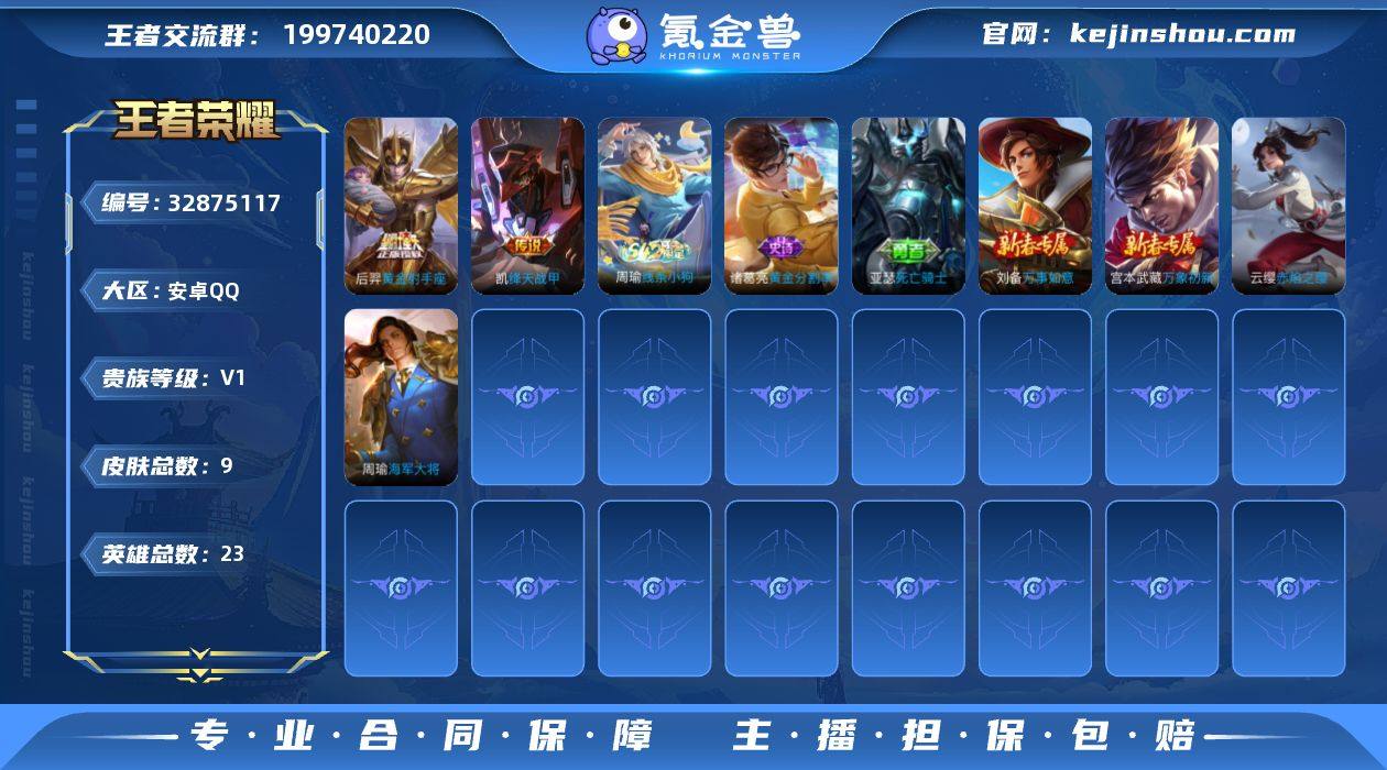 可换绑【精品小号】没有五级铭文 可二次BX5293 安卓Q-V0-9皮肤-2传说-1史诗【传说皮肤】:铠绛天战甲,后羿黄金射手座【战令限定】:周瑜线条小狗【史诗皮肤】:周瑜线条小狗,诸葛亮黄金分割率【其他皮肤】:宫本武藏万象初新,刘备万事如意,亚瑟死亡骑士,云缨赤焰之缨,周瑜海军大将