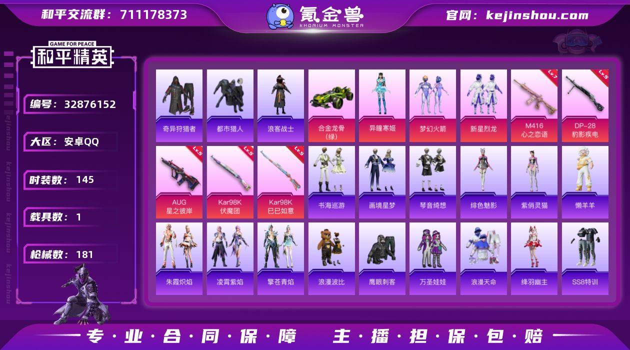 实名: 不可修改 时装数: 145 载具数: 1 枪械数: 181 战备数: 109 热门装扮: 奇异狩猎者,梦幻火箭(新101),浪漫波比,万圣娃娃,鹰眼刺客,都市猎人,新星烈龙,浪客战士,异瞳寒姬 载具: 合金龙骨(绿) 稀有枪皮: Kar98K伏魔团,M416心之恋语,AUG星之彼岸,Kar98K-巳巳如意,DP-28-豹影疾电 亮点: 安卓 手Q-3粉装-8特效枪-1载具-2粉色飞行器-56997热力值-14王牌印记-145套装-181枪皮【热门品类】:粉装-梦幻火箭,套装-浪漫天命,套装-都市猎人,套装-奇异狩猎者,套装-浪客战士,套装-浪漫波比【粉色套装】:粉装-梦幻火箭,粉装-新星烈龙,角色-异瞳寒姬【粉色枪皮等级】:M416-心之恋语(七级),AUG-星之彼岸(五级),AKS-74U-森灵之息(四级),Kar98K-伏魔团(五级),Kar98K-巳巳如意(五级),Mk14-福马献瑞(五级),AA12-G-萌骑幻想(二级),DP-28-豹影疾电(五级)【粉色载具】:合金龙骨(绿)【粉色枪皮】:M416-心之恋语,AUG-星之彼岸,AKS-74U-森灵之息,Kar98K-伏魔团,Kar98K-巳巳如意,Mk14-福马献瑞,AA12-G-萌骑幻想,DP-28-豹影疾电【粉色飞行器】:炫彩糖果飞行器,星之彼岸飞行器【粉色降落伞】:四圣焕新降落伞,星之彼岸降落伞,暗夜玫瑰降落伞,异瞳寒姬降落伞,极意拳锋...