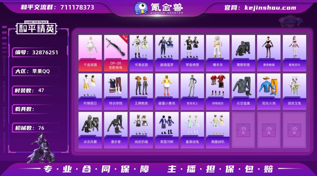 精品少萝号2粉3特 千金淑猫 苹果 手Q-2粉装-3特效枪-0载具-1粉色飞行器-20352热力值-4王牌印记-47套装-76枪皮 【粉色套装】:角色-千金淑猫,角色-虹云熊熊 【粉色枪皮等级】:UMP45-萌骑冒险(五级),Mk14-福马献瑞(五级),DP-28-豹影疾电(五级) 【粉色枪皮】:UMP45-萌骑冒险,Mk14-福马献瑞,DP-28-豹影疾电 【粉色飞行器】:炫彩糖果飞行器 【粉色降落伞】:蜜语绒猫降落伞,千金淑猫降落伞,无垠阁降落伞,喜羊羊与灰太狼降落伞,炫彩糖果降落伞 【稀有套装】:套装-炫彩糖果,套装-马上来财,角色-摩登魅猫,角色-蜜桃派对,玩偶服-懒羊羊,套装-书海巡游,套装-画境星梦,套装-琴音绮想,套装-雨过天青,套装-红釉青花 【稀有枪皮】:AUG-冰晶雪宝,SCAR-L-绶带小兔,M416-红色方程式,M416-蓝色火焰,GROZA-暮色玫影,AUG-耀粉歌者,M762-天降萌叽,G36C-灵驹仙姬,AC-VAL-彩虹甜喵,ACE32-画境星梦,UZI-啾咪啾咪,UZI-影袭,UZI-炫彩节奏,汤姆逊-天降萌叽,汤姆逊-樱桃泡泡,汤姆逊-像素花束,MP5K-画境星梦,Kar98K-红色方程式,M24-影袭,莫辛纳甘-蜜语绒猫,AMR-喜羊羊与灰太狼,MK20-H-绶带小兔,M1加兰德-画境星梦,S686-蜜语绒猫,S686-生命誓言,S12K-极意拳...