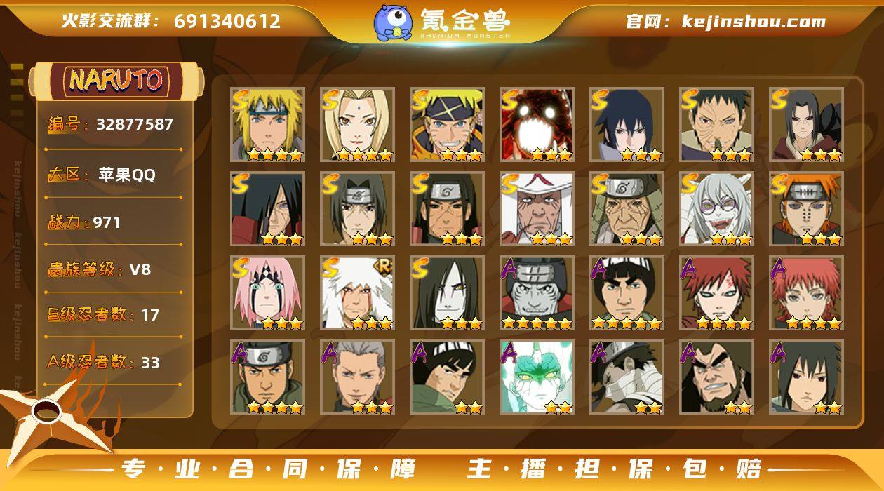 【2655】V8 17S 33A 971万战力 热门A忍战奇拉比 最终章雏田 暴怒带土 S碎片金水门75片 带土91片 舍人65片 YY2085 【S级忍者】:猿飞日斩「秽土转生」(3星),千手柱间「秽土转生」(3星),宇智波鼬「秽土转生」(3星),宇智波斑「秽土转生」(3星),春野樱「忍界大战」(3星),宇智波带土「忍界大战」(3星),宇智波鼬「须佐能乎」(3星),自来也「舞之豪杰」(3星),大蛇丸(3星),纲手(4星),猿飞日斩(3星),波风水门(4星),药师兜「仙人模式」(3星),佩恩「天道」(3星),宇智波佐助「永恒万花筒」(3星),漩涡鸣人「暴怒·第六尾」(3星),漩涡鸣人·宇智波佐助(3星) 【A级忍者】:长门「青年」(2星),波风水门「青年」(2星),达鲁伊「博人传」(2星),迪达拉(2星),迪达拉「秽土转生」(2星),奇拉比(2星),奇拉比「忍界大战」(2星),飞段(3星),飞段「死司凭血」(2星),干柿鬼鲛(5星),漩涡博人「桃式显现」(2星),迈特凯(5星),桃地再不斩「秽土转生」(2星),我爱罗「疾风传」(4星),蝎(4星),小南「神驹佑将」(2星),猿飞阿斯玛(4星),宇智波鼬(2星),宇智波佐助「须佐能乎」(2星),宇智波佐助「万花筒写轮眼」(2星),照美冥「五代目水影」(2星),日向宁次「忍界大战」(2星),日向雏田...