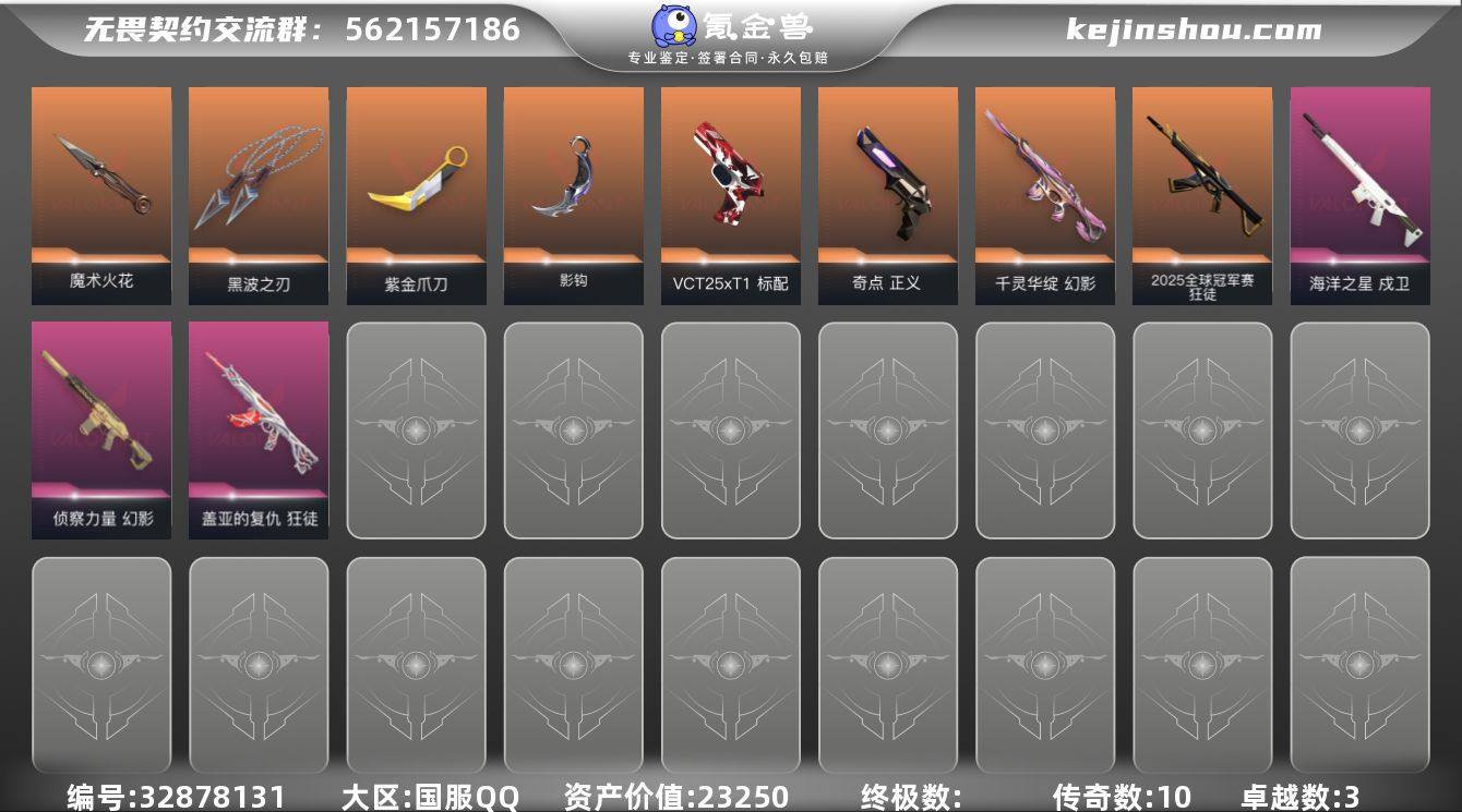 【自带包赔 可赔三倍】:库存价值 23250 当前黄金极品4t0近战 性价比多热门库存账号剩余 300R点 【限定】: 2025全球冠军赛 狂徒 【近战】: 魔术火花, 影钩, 黑波之刃, 紫金爪刀 【狂徒】: 2025全球冠军赛 狂徒, 盖亚的复仇 狂徒 【幻影】: 侦察力量 幻影, 千灵华绽 幻影 【正义】: 奇点 正义 【戍卫】: 海洋之星 戍卫 【标配】: VCT25 x T1 标配 【概要】: 总皮肤42 终极0 传奇10 卓越 3刀皮4 英雄 28 LV 182 历史最高:黄金 当前段位:黄金 已使用 605R点 剩余 300R点 可二次 卡面、挂饰、其他皮肤请看截图 道具、段位等以实际验号为准。如账号因没有维护,赛季更新等不可抗因素发生变化,不属于账号质量问题"