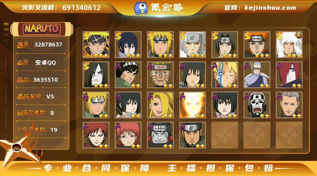 8S忍/19A忍/战力363W/V5/区服1672 【S忍者】 宇智波佐助「漩涡鸣人」,宇智波佐助「永恒万花筒」,自来也「舞之豪杰」,千手扉间「秽土转生」,宇智波鼬「须佐能乎」,佩恩「天道」,波风水门,大蛇丸, 【A忍者】 机械鸣人「初始形态」,迈特凯「青春爆炸」,长十郎「六代目水影」,漩涡博人「桃式显现」,宇智波泉奈,长门「青年」,波风水门「青年」,宇智波佐助「须佐能乎」,迪达拉「秽土转生」,漩涡鸣人「九尾查克拉」,宇智波佐助「万花筒写轮眼」,飞段「死司凭血」,飞段,我爱罗「疾风传」,蝎,干柿鬼鲛,猿飞阿斯玛, PX_2475361