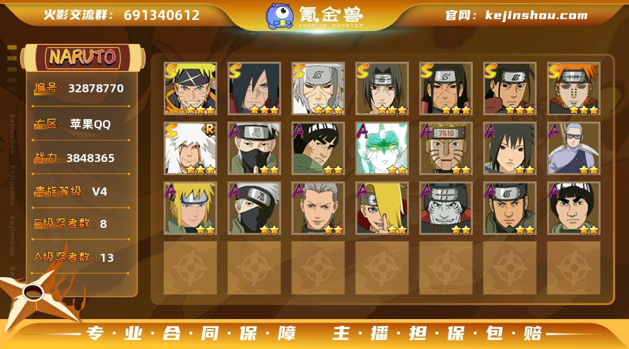 IOS/8S忍/13A忍/战力384W/V4/区服859 【S忍者】 宇智波佐助「漩涡鸣人」,宇智波斑「秽土转生·解」,千手柱间「秽土转生」,自来也「舞之豪杰」,千手扉间「秽土转生」,千手柱间,宇智波鼬「须佐能乎」,佩恩「天道」, 【A忍者】 旗木卡卡西「神威对决」,机械鸣人「初始形态」,巳月「仙人模式」,迈特凯「青春爆炸」,长十郎「六代目水影」,宇智波泉奈,波风水门「青年」,旗木卡卡西「忍界大战」,飞段,迪达拉,干柿鬼鲛,猿飞阿斯玛,迈特凯, PX_2536421