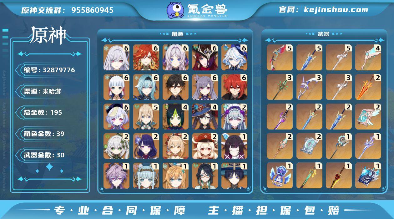 平台的同配置同金数随便对比!认真看,本期幽境132秒金皮顶级恰斯卡32秒薄纱n6冰锅,期期随便进180,换绑干净,邮箱未实名。十多个满命角色三大主流战舰队伍大c全拉百级。顶级纳塔战舰满火满奶。高配冰水战舰满丝满芙,通解五灵王6+5恰斯卡,三组队伍随便碾压深渊幽境,无视机制对策卡!爽玩。全图满探。大小月卡已开,还有半年多。练度也拉满。去打州了,退游出