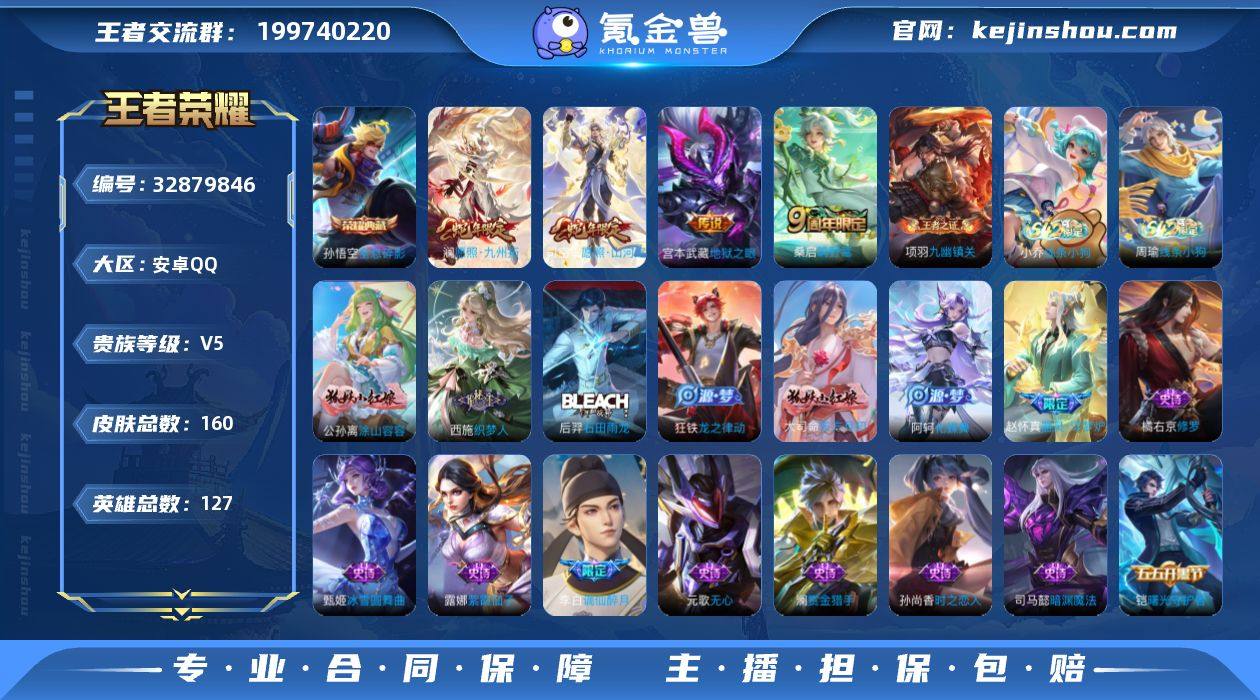 安卓Q-V5-最强王者段位-127英雄-160皮肤-1典藏皮肤-4传说-46史诗 【英雄全皮】:孙权全皮,敖隐全皮 【荣耀典藏】:孙悟空全息碎影 【传说皮肤】:司空震愿照山河定,澜愿照九州拓,桑启鸣野蒿,宫本武藏地狱之眼 【限定皮肤】:姜子牙天穹之誓,李白谪仙醉月,狄仁杰阴阳师,赵云皇家上将,孙尚香蔷薇恋人,元歌无心,狄仁杰魔术师,项羽海滩派对,李元芳云中旅人,鬼谷子五谷丰年,百里玄策原初追逐者,裴擒虎擒涛扼浪,云中君纤云弄巧,嫦娥暖冬兔眠,鲁班大师探海日志,桑启海盐诗旅,暃星界游侠,张良古海寻踪,鬼谷子天穹祈灯,沈梦溪龙舞盛年,刘邦剑破天穹,程咬金群星魔术团,周瑜熔金海岸 【年限皮肤】:司空震愿照山河定,澜愿照九州拓 【赛季限定】:李元芳云中旅人,桑启海盐诗旅,裴擒虎擒涛扼浪,鲁班大师探海日志,张良古海寻踪,鬼谷子天穹祈灯,刘邦剑破天穹,姜子牙天穹之誓,东皇太一噬灭天穹,太乙真人谧流熔炉,甄姬逆浪荇歌,亚瑟荣光之誓,百里玄策原初追逐者,牛魔星界战将,项羽九幽镇关 【战令限定】:暃星界游侠,嫦娥暖冬兔眠,孙膑茶境仙,马超访茗客,周瑜线条小狗,小乔线条小狗 【史诗皮肤】:周瑜线条小狗,小乔线条小狗,项羽九幽镇关,公...