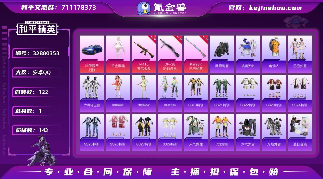 安卓 手Q-1粉装-3特效枪-1载具-1粉色飞行器-43122热力值-12王牌印记-122套装-143枪皮 【热门品类】:套装-浪漫天命,套装-龟仙人 【粉色套装】:角色-千金淑猫 【粉色枪皮等级】:M416-五爪金龙(七级),Kar98K-巳巳如意(五级),DP-28-豹影疾电(五级) 【粉色载具】:玛莎拉蒂Ghibli(蓝) 【粉色枪皮】:M416-五爪金龙,Kar98K-巳巳如意,DP-28-豹影疾电 【粉色飞行器】:炫彩糖果飞行器 【粉色降落伞】:青春物语降落伞,庄周梦蝶降落伞,蜜语绒猫降落伞,辉耀战甲降落伞,鬼刀降落伞,喜羊羊与灰太狼降落伞,炫彩糖果降落伞 【稀有套装】:套装-龟仙人,套装-巳巳如意,套装-雪国风尚,套装-火种守卫者,套装-糖糖葫芦,套装-青团波波,套装-极速光影 【稀有枪皮】:AKM-彩虹符号,AKM-影袭,AKM-灼热熔岩,AKM-破晓战魂,AKM-霓虹街区,AKM-龙的传人,SCAR-L-炫彩节奏,SCAR-L-玉兔迎春,SCAR-L-红色方程式,M416-糯团青竹,M416-红色方程式,M416-蓝色火焰,GROZA-影袭,GROZA-田园牧歌,AUG-天降萌叽,AUG-耀粉歌者,AUG-绝对恒星,QBZ-飞驰魅影,M762-奇异狩猎者,Mk47-妙红点点,AC-VAL-天降萌叽,蜜獾-垂柳戏鸭,蜜獾-天降萌叽,蜜獾-娇憨猪猪,UZI-啾咪啾咪,UZI-墨染...