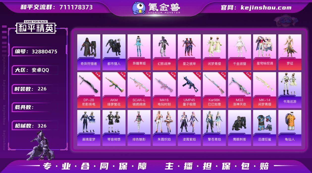 满级地铁 都市 奇异 狩猎者 连体王者安卓 手Q-7粉装-11特效枪-0载具-2粉色飞行器-103537热力值-22王牌印记-226套装-326枪皮 【热门品类】:套装-都市猎人,套装-奇异狩猎者,套装-龟仙人,角色-8号机,角色-Mark.06 【粉色套装】:粉装-幻影战神,粉装-星之彼岸,粉装-闲梦青缨,角色-千金淑猫,粉装-星穹咏叹调,角色-罗征,角色-异瞳寒姬 【粉色枪皮等级】:AKM-绿萝繁花(五级),SCAR-L-锦绣绵绵(五级),M416-电玩时刻(五级),UMP45-量子极限(五级),Kar98K-巳巳如意(五级),Mk14-福马献瑞(五级),AA12-G-萌骑幻想(二级),DP-28-豹影疾电(五级),MG3-洛神天依(二级),信号枪-金乌曜日(三级) 【粉色枪皮】:AKM-绿萝繁花,SCAR-L-锦绣绵绵,M416-电玩时刻,UMP45-量子极限,Kar98K-巳巳如意,Mk14-闲梦青缨,Mk14-福马献瑞,AA12-G-萌骑幻想,DP-28-豹影疾电,MG3-洛神天依,信号枪-金乌曜日 【粉色飞行器】:炫彩糖果飞行器,宁雨蝶飞行器 【粉色降落伞】:梦幻火箭降落伞,银刃赛罗降落伞,香水柠檬降落伞,洛神天依降落伞,环太平洋降落伞,飒粉甜心降落伞,闲梦青缨降落伞,炫光之旅降落伞,星梦奇缘降落伞,初号机 觉醒Ver.降落伞,魔法神域降落伞,金丰海韵降落伞,忍...