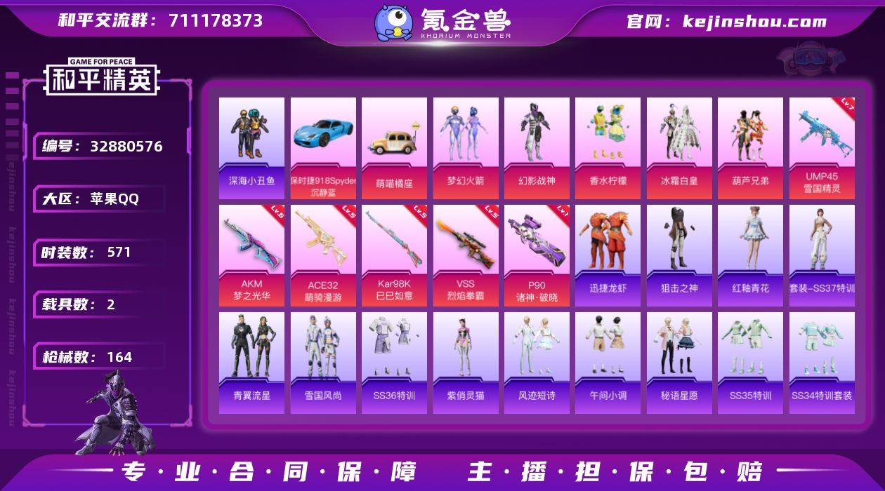 精氪素材号/【火箭少女/幻影战神/深海小丑鱼/东方飞龙】6级ak梦之光华/萌神柯基/浪漫波比/狂沙舞者/战队服/满级雪国精灵/小熊背包/保时捷918/地铁40点天赋 实名: 可修改 时装数: 571 载具数: 2 枪械数: 164 战备数: 101 热门装扮: 梦幻火箭(新101),幻影战神,呆萌铁蟹,深海小丑鱼,浪漫波比,迅捷狂鲨,东方飞龙,香水柠檬,怪兽之王,冰霜白皇,葫芦兄弟,萌神柯基 载具: 萌喵橘座,保时捷918Spyder(沉静蓝) 稀有枪皮: UMP45雪国精灵,AKM梦之光华,VSS烈焰拳霸,Kar98K-巳巳如意,ACE32-萌骑漫游,P90-诸神·破晓