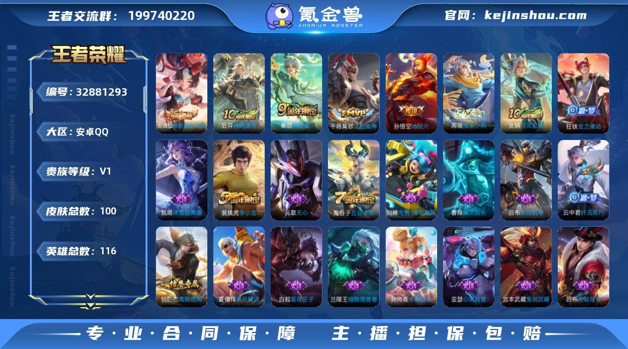 实名: 可修改 贵族等级: V1 英雄数: 116 皮肤数: 100 荣耀水晶: 颠倒童话·魔镜 传说皮: 久胜战神,地狱火,神树通天 限定皮: 李小龙,五谷丰年,鸣野蒿 亮点: 安卓Q-V1-至尊星耀IV段位-116英雄-100皮肤-1典藏皮肤-4传说-23史诗【英雄全皮】:孙权全皮【荣耀典藏】:安琪拉颠倒童话魔镜【传说皮肤】:后羿神树通天,桑启鸣野蒿,干将莫邪久胜战神,孙悟空地狱火【限定皮肤】:狄仁杰阴阳师,元歌无心,老夫子醍醐杖,李元芳云中旅人,干将莫邪胡桃夹子,鬼谷子五谷丰年,弈星混沌棋,沈梦溪大漠名商,明世隐疑决卦,裴擒虎李小龙,裴擒虎擒涛扼浪,云中君纤云弄巧,鲁班大师探海日志,桑启海盐诗旅,张良古海寻踪,鬼谷子天穹祈灯,刘邦剑破天穹【赛季限定】:弈星混沌棋,明世隐疑决卦,老夫子醍醐杖,沈梦溪大漠名商,李元芳云中旅人,桑启海盐诗旅,裴擒虎擒涛扼浪,鲁班大师探海日志,张良古海寻踪,鬼谷子天穹祈灯,刘邦剑破天穹,东皇太一噬灭天穹,太乙真人谧流熔炉,亚瑟荣光之誓【战令限定】:周瑜线条小狗【史诗皮肤】:周瑜线条小狗,女娲万灵启世,狂铁龙之律动,刘禅电玩爆裂旋风,元歌无心,鬼谷子五谷丰年,云中君纤云弄巧,裴擒虎李小龙,狄仁杰鹰眼统帅,白起星夜...