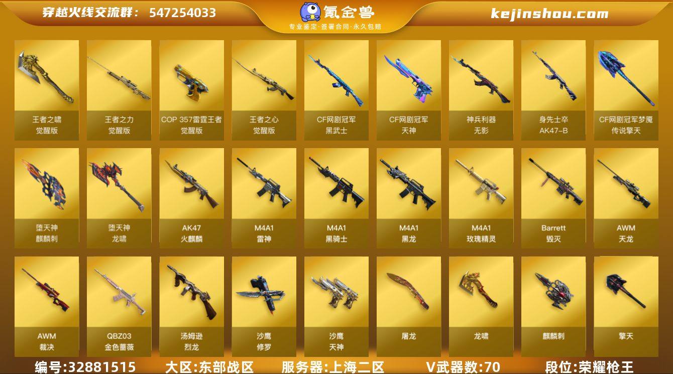 上海二区-77V-5王者武器数-0炫金武器数 【热门武器】:QBZ03-金色蔷薇,M200-竞技荣光,M4A1-黑骑士,汤姆逊-烈龙*3,斯泰尔-蝴蝶,USP-雷暴,沙鹰-修罗,金刚伞 【音效卡】:屠龙-动感闪耀 音效卡,M4A1-雷神音效卡,M4A1-黑骑士音效卡,Barrett-毁灭音效卡,绝迹语音包 【皮肤】:雷神-暗月,雷神-能量核心,雷神-宠儿-2019MVP,火麒麟-AG战队皮肤,火麒麟-雷神,火麒麟-平天大圣,火麒麟-百城,毁灭-荣耀之怒,毁灭-黑大圣皮肤,黑骑士-暗月,战神-粉色甜心皮肤,战神-紫绶金章皮肤,AK47-B-常胜将军-曹操,AK47-B-常胜将军-孙权,天龙-能量核心,AWM-天龙-传奇70KG 【角色】:魅影,电竞教官-云悠悠,王者-瞳-闭月羞花,王者葵-惊若翩鸿,王者复仇,王者涂鸦,狐影,乔伊教练,暗夜-X,暗夜审判,初恋灵狐,嘉年华灵狐,娟娟,灵狐者-X,灵狐者-黄金海岸,灵狐者-七夕宝贝,龙儿-小淘气,潘多拉-X,潜龙队-X,青霞仙子,斯沃特-X,蜀雪,铁骑荣耀,新娜塔莎,影武者-X,职业选手 【人偶武器】:M4A1-雷神-精英刀锋,斯泰尔-蝴蝶,AWM-灵狐-15周年嘉年华,迷你深渊冰龙,迷你波特博士,夺魂*2,迷你生化手雷,深渊终结者手雷,闪光弹-貂蝉,高爆手雷-大乔,迷你巨石泰坦-魔...