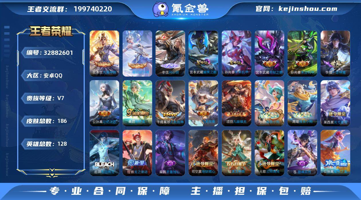 实名: 可修改 贵族等级: V7 英雄数: 128 皮肤数: 186 荣耀水晶: 九霄神辉,最初的交响 无双皮: 问心剑 星传说: 未来机甲,幽冥之眼 传说皮: 久胜战神,一念神魔,末日机甲-孙尚香,地狱之眼,飞鸢探春,记忆之芯 限定皮: 御风骁将,烈魂,天狼溯光者,蜜橘之夏,乒乒小将,逐梦之星,霸王别姬-项羽,霸王别姬-虞姬,高山流水,鸣野蒿 亮点: BHC60556,,,发育63段-金标戈娅12195-金标鲁班10658-金标黄忠-金标李元芳-金标艾琳-银标狄仁杰10015-问心剑-2星元,,,安卓Q-V7-最强王者段位-128英雄-186皮肤-2典藏皮肤-1无双-7传说-72史诗【英雄全皮】:孙权全皮,苍全皮,敖隐全皮,空空儿全皮【荣耀典藏】:花木兰九霄神辉,伽罗最初的交响【无双皮肤】:李信问心剑【传说皮肤】:桑启鸣野蒿,公孙离记忆之芯,李元芳飞鸢探春,李信一念神魔,干将莫邪久胜战神,孙尚香末日机甲,宫本武藏地狱之眼【限定皮肤】:姜子牙天穹之誓,狄仁杰阴阳师,赵云皇家上将,墨子神迹守卫,鲁班七号乒乒小将,庄周高山流水,高渐离玩趣恶龙,吕布猎兽之王,吕布御风骁将,元歌云间偶戏,元歌无心,马可波罗逐梦之星,狄仁杰魔术师,狄仁杰万华元夜,达摩星际陆战队,达摩沙漠行僧,项羽海滩派对,项羽霸王别姬,...